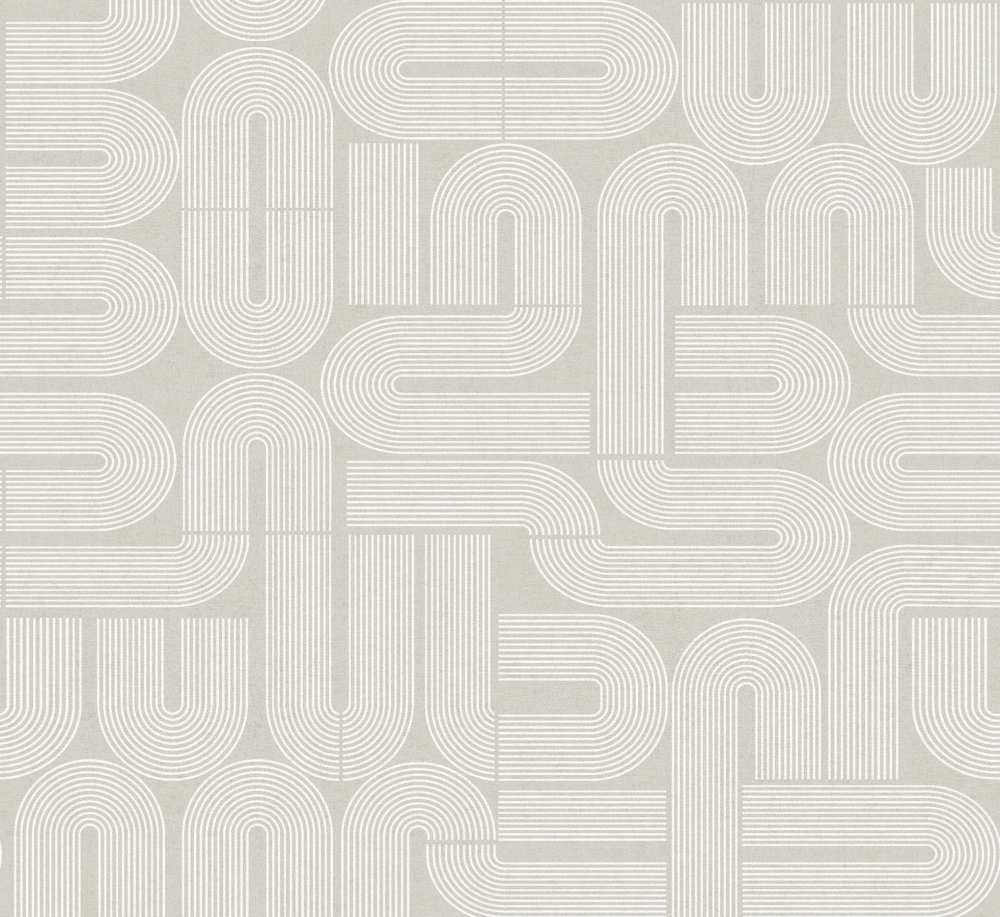 Motsättningarna gör avtryck genom grafiska kontraster och geometriska former som skapar estetiska mönster. I Grafico formar strikta linjer, rytmiska mjuka bågar och optiska illusioner en djärv men balanserad stil som både utmanar och omfamnar rummet. Välj mellan kaxiga tolkningar med starka kontraster, dova sofistikerade färgställningar och metalliska detaljer för att addera dramatik, djup och tidlös elegans till ditt hem. Grå tapet med retro mönster i vitt. Väggmotiv, 4 våder, 49 cm/våd, repeterbar