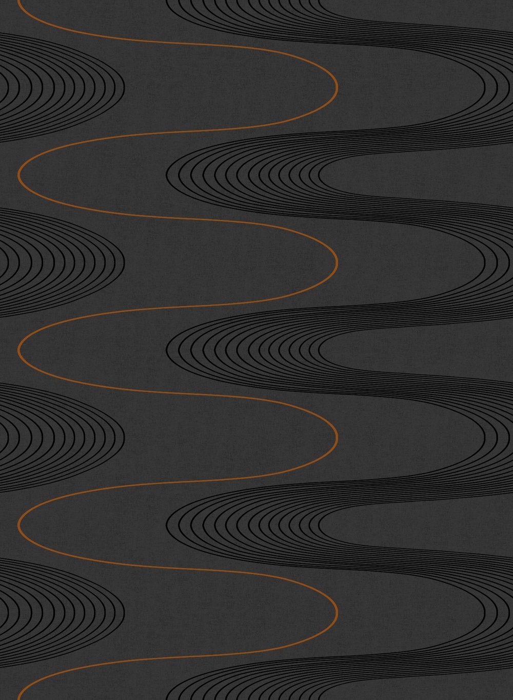Motsättningarna gör avtryck genom grafiska kontraster och geometriska former som skapar estetiska mönster. I Grafico formar strikta linjer, rytmiska mjuka bågar och optiska illusioner en djärv men balanserad stil som både utmanar och omfamnar rummet. Välj mellan kaxiga tolkningar med starka kontraster, dova sofistikerade färgställningar och metalliska detaljer för att addera dramatik, djup och tidlös elegans till ditt hem. Svart tapet med vågigt mönster i svart och terrakotta. Väggmotiv, 4 våder, 49 cm/våd, repeterbar