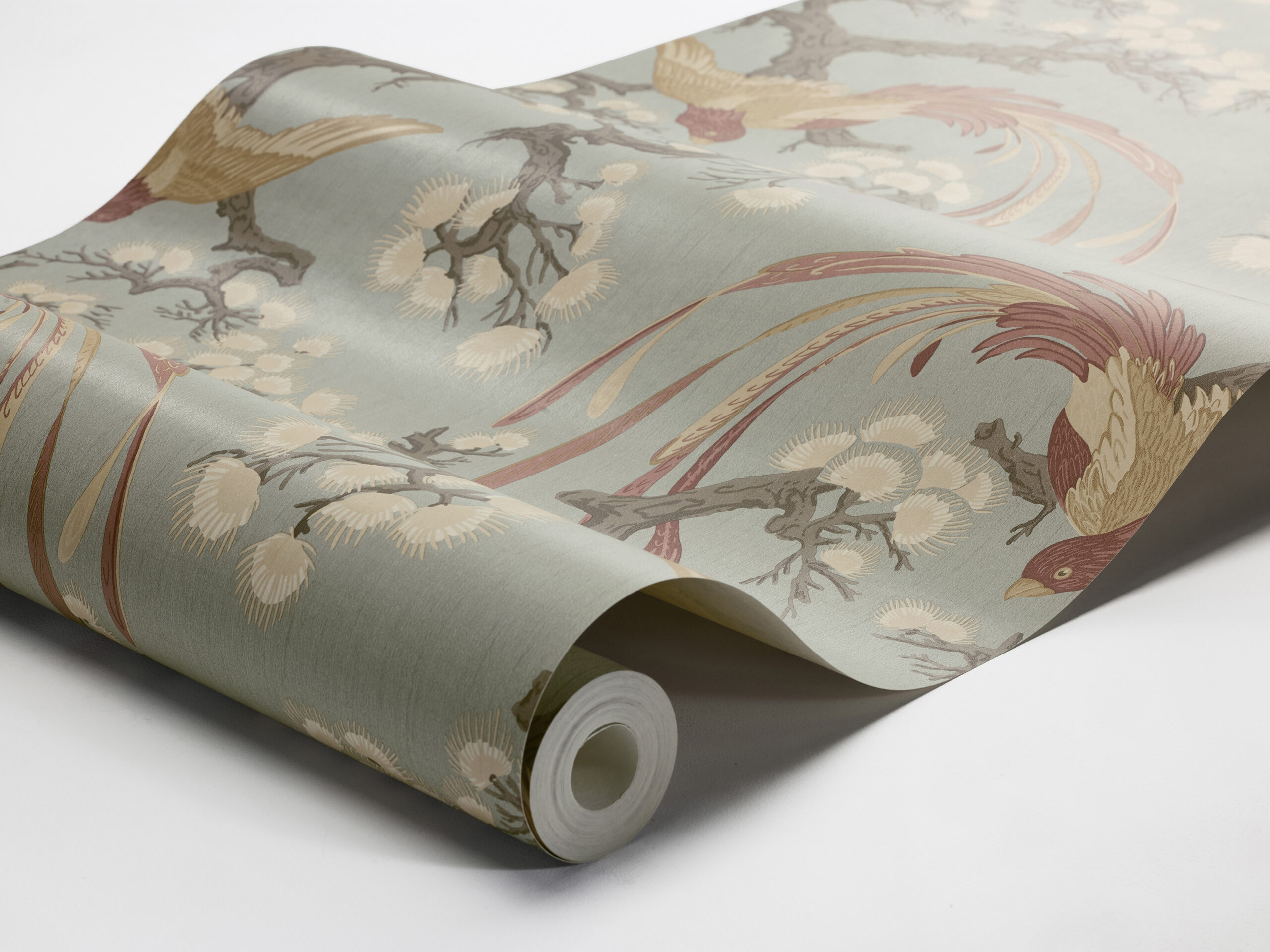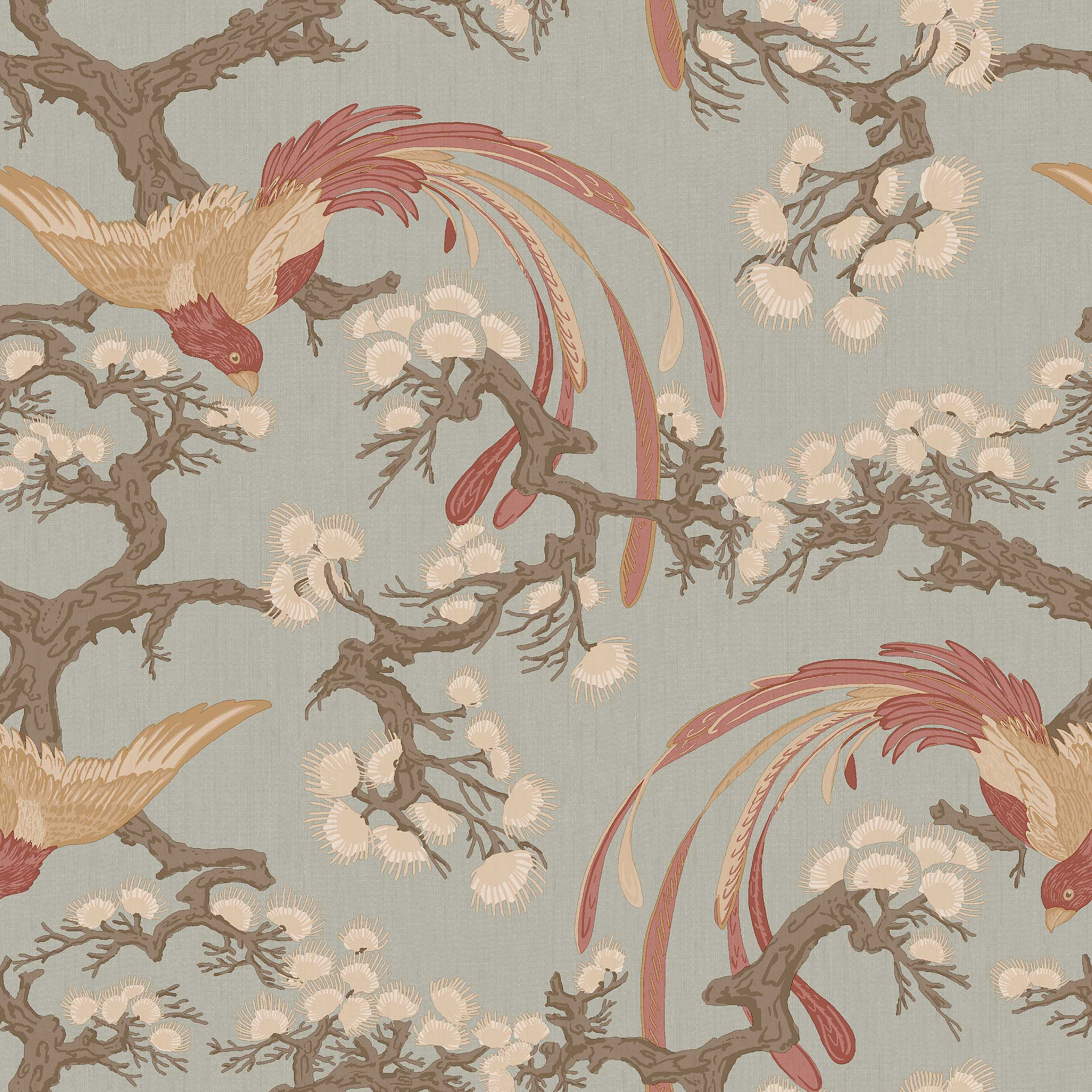 Fenix är en elegant och mycket dekorativ tapet med tydliga influenser från asiatiskt bildspråk. Det skulpturala grenverket och de färgstarka fåglarna ger ett levande men också harmoniskt intryck på väggen. Här går tapeten Fenix i en varm, ljus färgskala: mjuka nyanser av gråbrunt, beige, aprikos, rostrött och cremevitt mot en ljust gröngrå bakgrund.