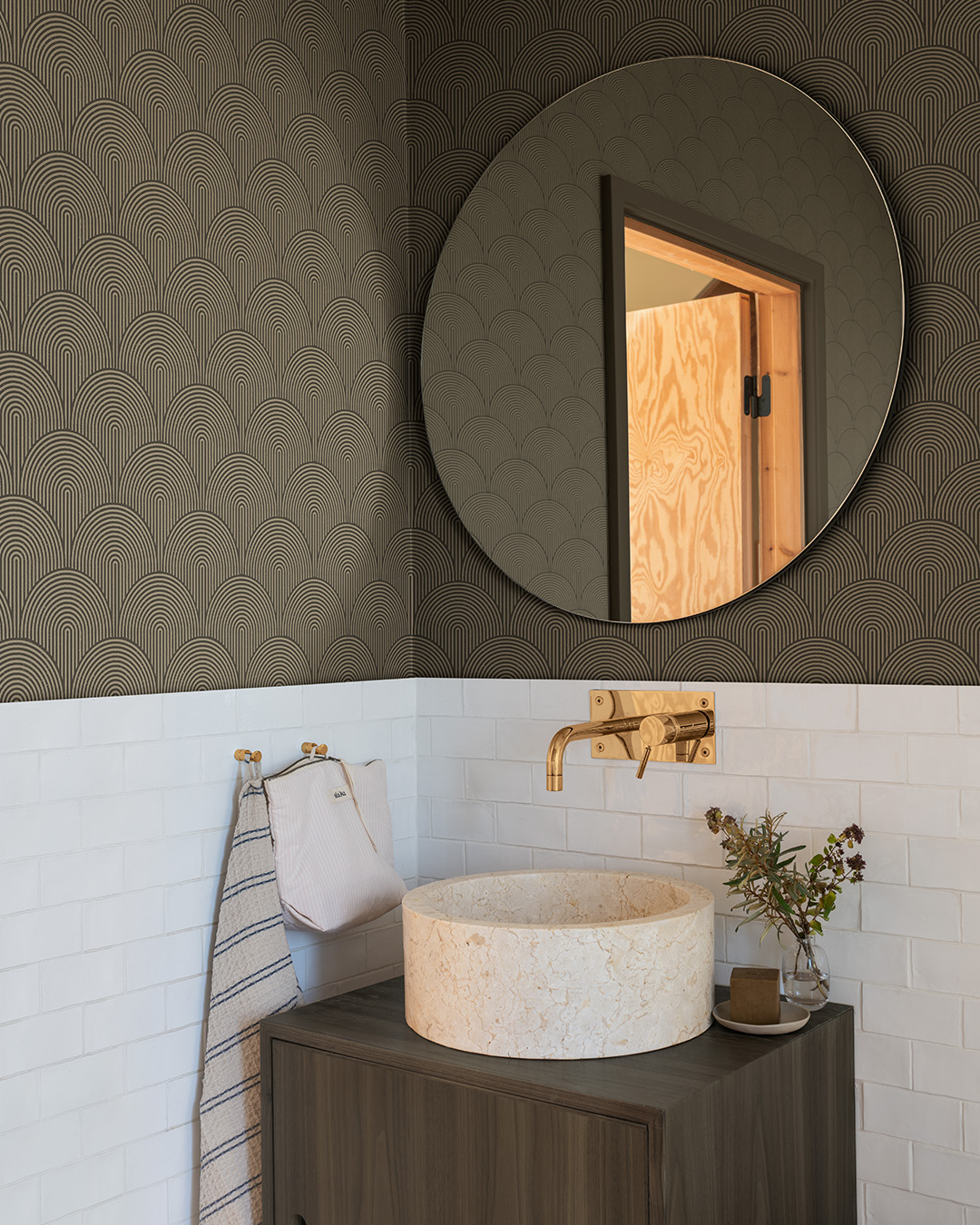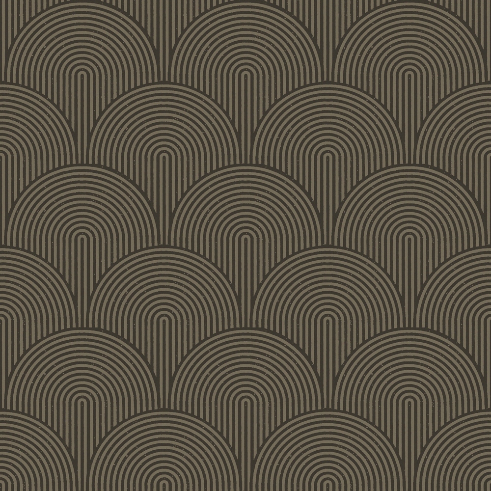 Motsättningarna gör avtryck genom grafiska kontraster och geometriska former som skapar estetiska mönster. I Grafico formar strikta linjer, rytmiska mjuka bågar och optiska illusioner en djärv men balanserad stil som både utmanar och omfamnar rummet. Välj mellan kaxiga tolkningar med starka kontraster, dova sofistikerade färgställningar och metalliska detaljer för att addera dramatik, djup och tidlös elegans till ditt hem. Tapet med mörkbrun botten och art deco mönster i form av bruna bågar