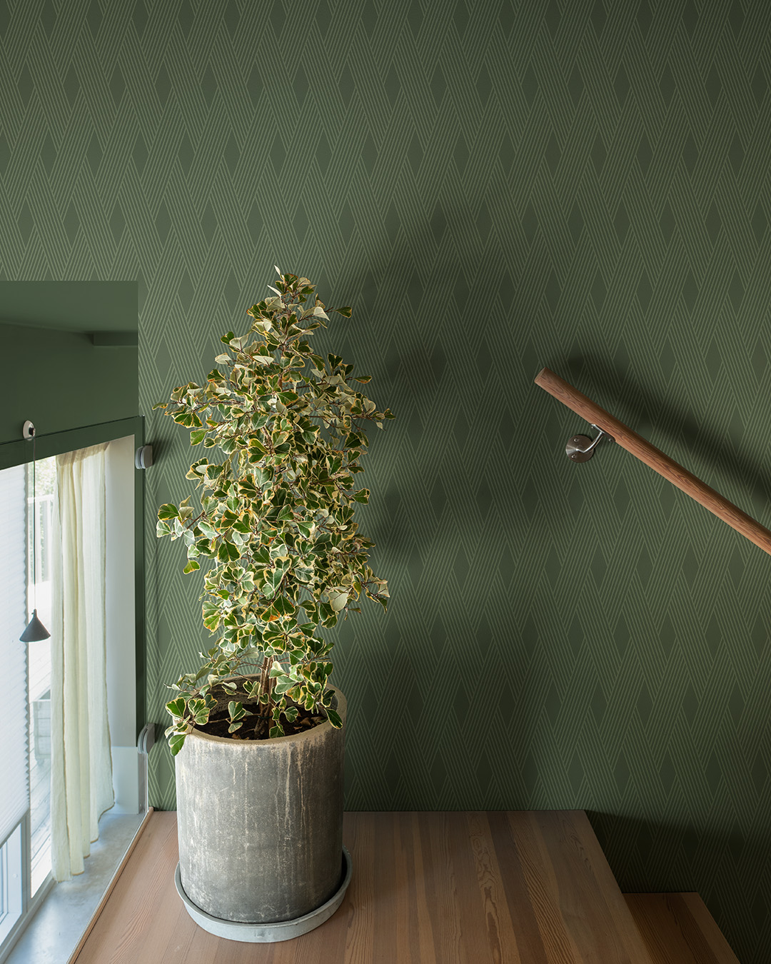 Motsättningarna gör avtryck genom grafiska kontraster och geometriska former som skapar estetiska mönster. I Grafico formar strikta linjer, rytmiska mjuka bågar och optiska illusioner en djärv men balanserad stil som både utmanar och omfamnar rummet. Välj mellan kaxiga tolkningar med starka kontraster, dova sofistikerade färgställningar och metalliska detaljer för att addera dramatik, djup och tidlös elegans till ditt hem. Tapet med grön botten och ett geometriskt mörkgrönt