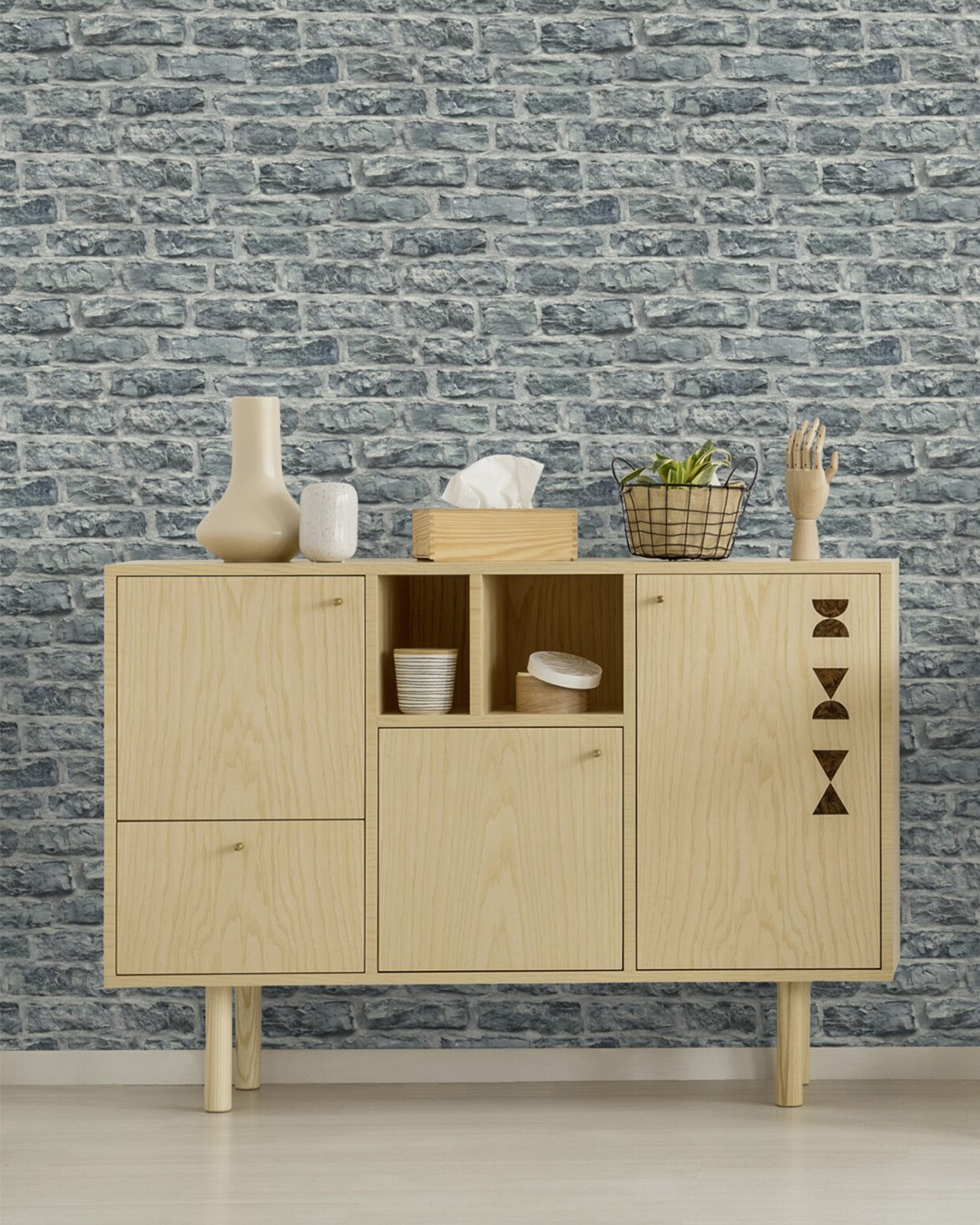 Modernt med inspiration av råa material och tidens naturliga patina. Här möts sten, betong, tegel och trä i realistiska ytor med tydlig struktur och djup. Färgskalan är harmonisk och jordnära med nyanser av grått, kalkvitt, sand, beige, rost och varma bruna toner. Subtila skiftningar och slitna detaljer ger tapeterna ett levande uttryck som känns både äkta och tidlöst. Kollektionen har en avskalad industriell stil som skapar lugn och karaktär i rummet. Mökrgrå tapet med tegelstenar
