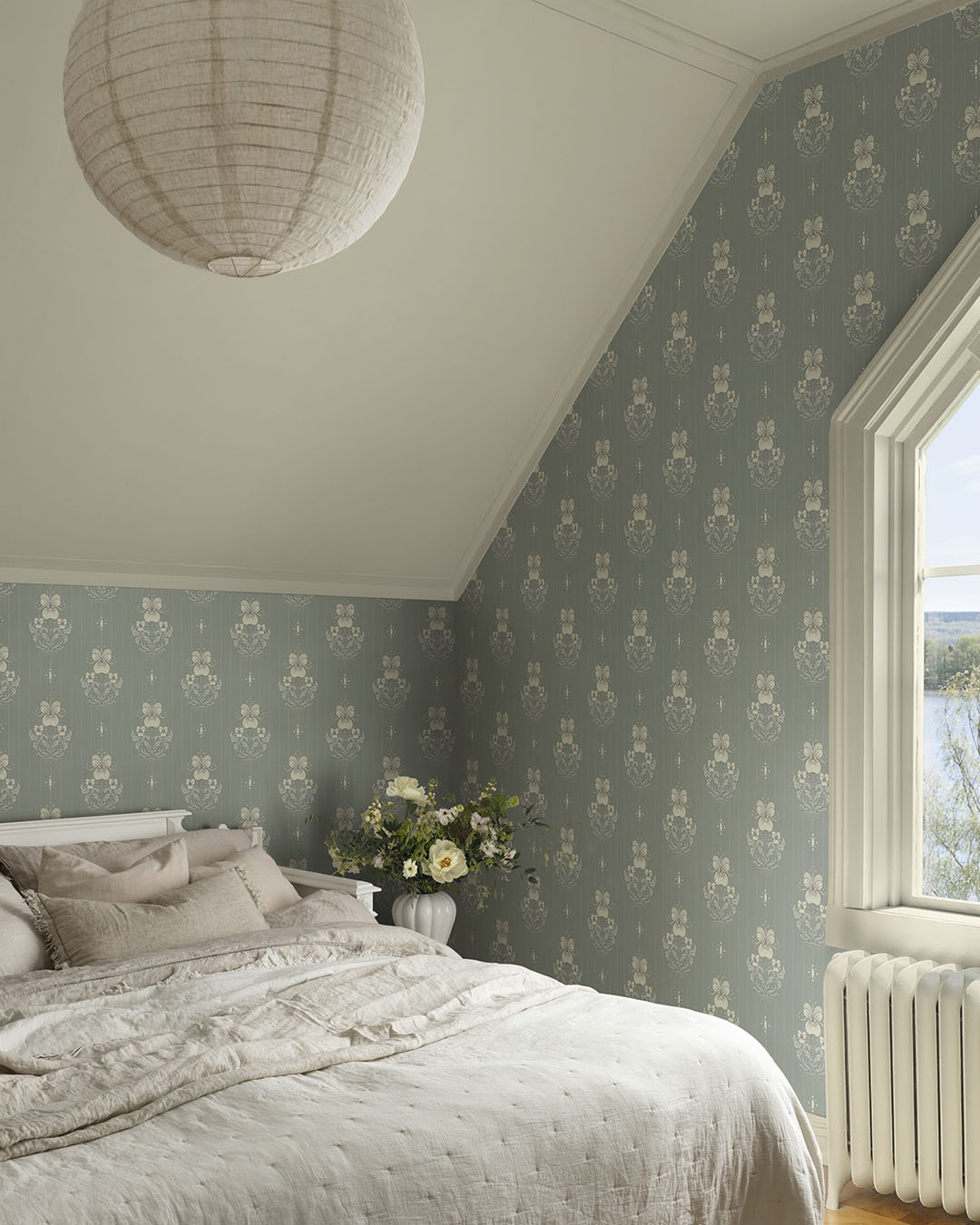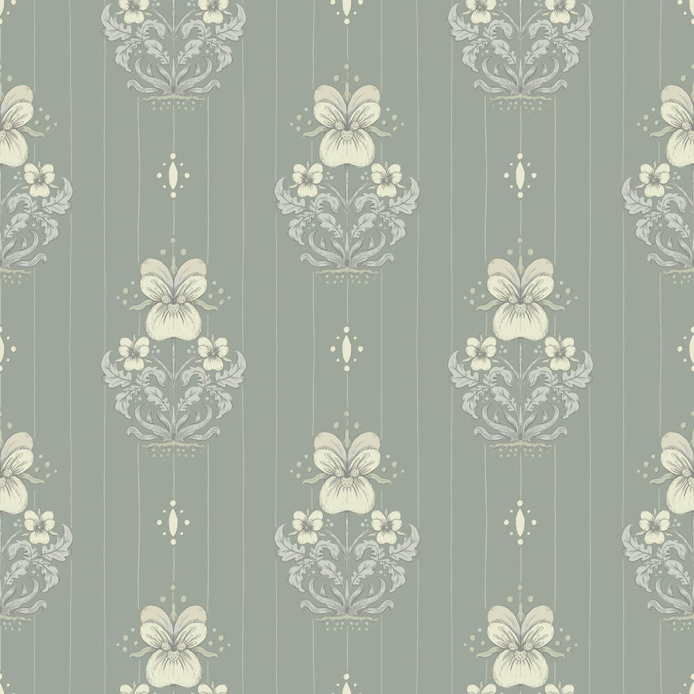 I kollektionen Saltviken har designern Lina Schnaufer jobbat med minnen från hennes gammelmormors föräldrahem i Kolmyrarna på västkusten. Huset är byggt någon gång under 1800-talet och var från början en enkel boning med tillhörande uthus och liten åker. Senare blev det fritidshus för de olika släktgrenarna under somrarna och loven. Huset kallas Saltvik efter viken som huset är beläget vid. Kollektionen Saltviken har tagit inspiration från Linas vistelser som barn och naturen runtomkring. Somrar som spenderades med hennes kusiner, cyklandes på smala barriga stigar ner till havet, plockandes blåbär och ätandes sillunch i bersån. En äkta sommardröm. Grågrön tapet med violer i creme och grått.