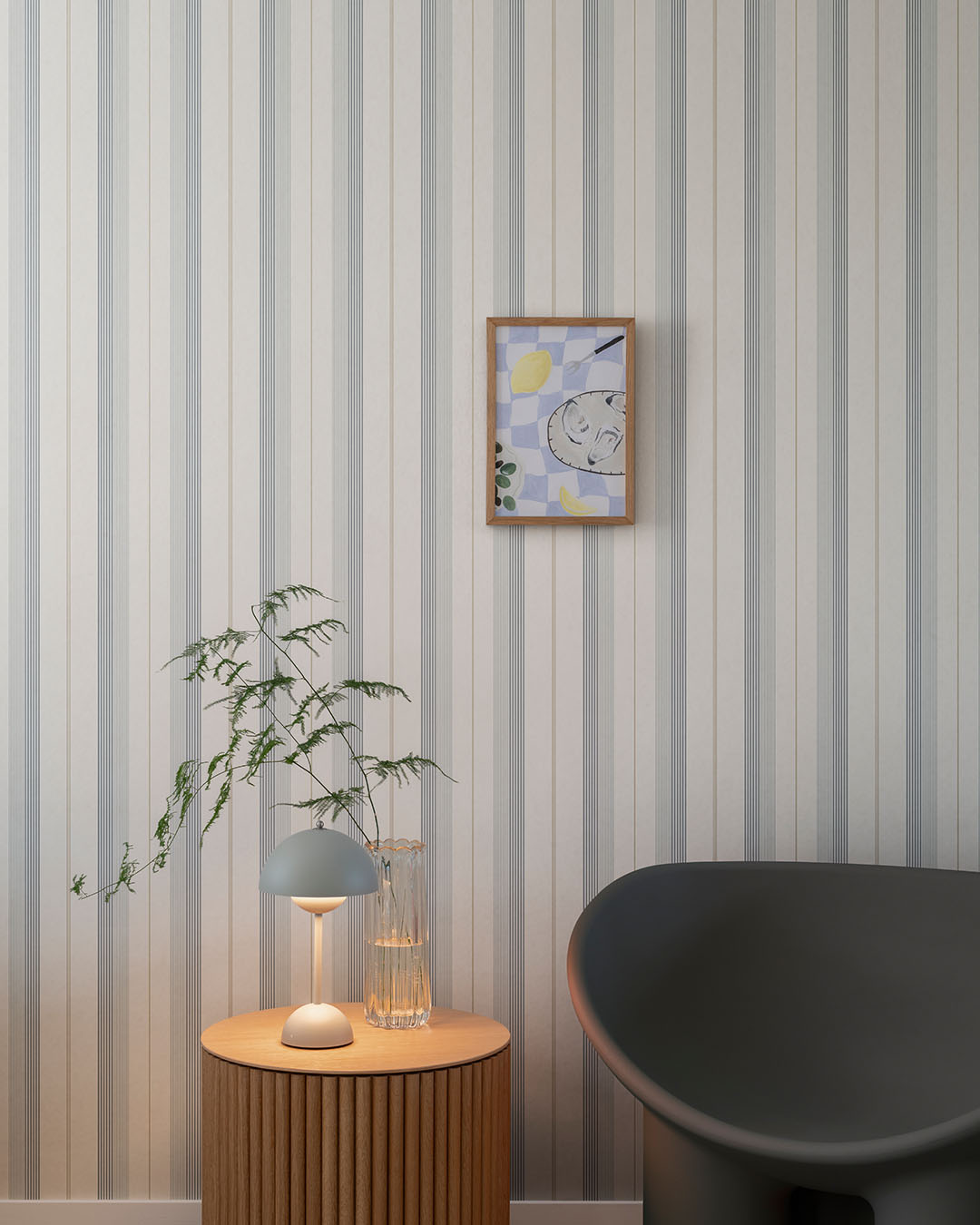 Tapetkollektionen Ester tar dig på en långsam promenad i skogen där solens ljus strilar in genom löven på en skir hängbjörk, där doften av fuktig mossa fyller luften och där lätt dagg fortfarande ligger på lövverkens ytor. Tapet med varierande ränder i blått och varmt vitt. Mönternamn Herrgård.