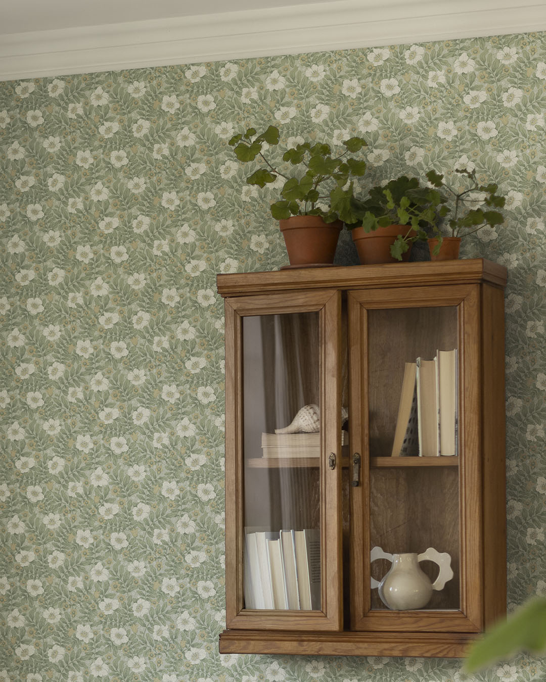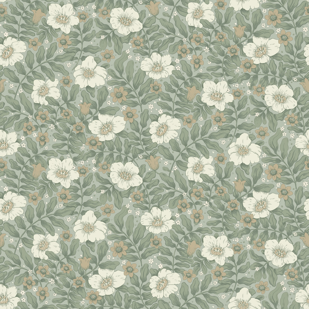 I kollektionen Saltviken har designern Lina Schnaufer jobbat med minnen från hennes gammelmormors föräldrahem i Kolmyrarna på västkusten. Huset är byggt någon gång under 1800-talet och var från början en enkel boning med tillhörande uthus och liten åker. Senare blev det fritidshus för de olika släktgrenarna under somrarna och loven. Huset kallas Saltvik efter viken som huset är beläget vid. Kollektionen Saltviken har tagit inspiration från Linas vistelser som barn och naturen runtomkring. Somrar som spenderades med hennes kusiner, cyklandes på smala barriga stigar ner till havet, plockandes blåbär och ätandes sillunch i bersån. En äkta sommardröm. Blommig tapet i nyanser av dov turkos, vit och nougat.