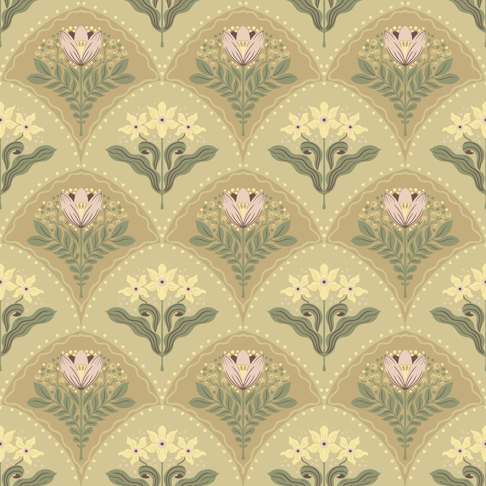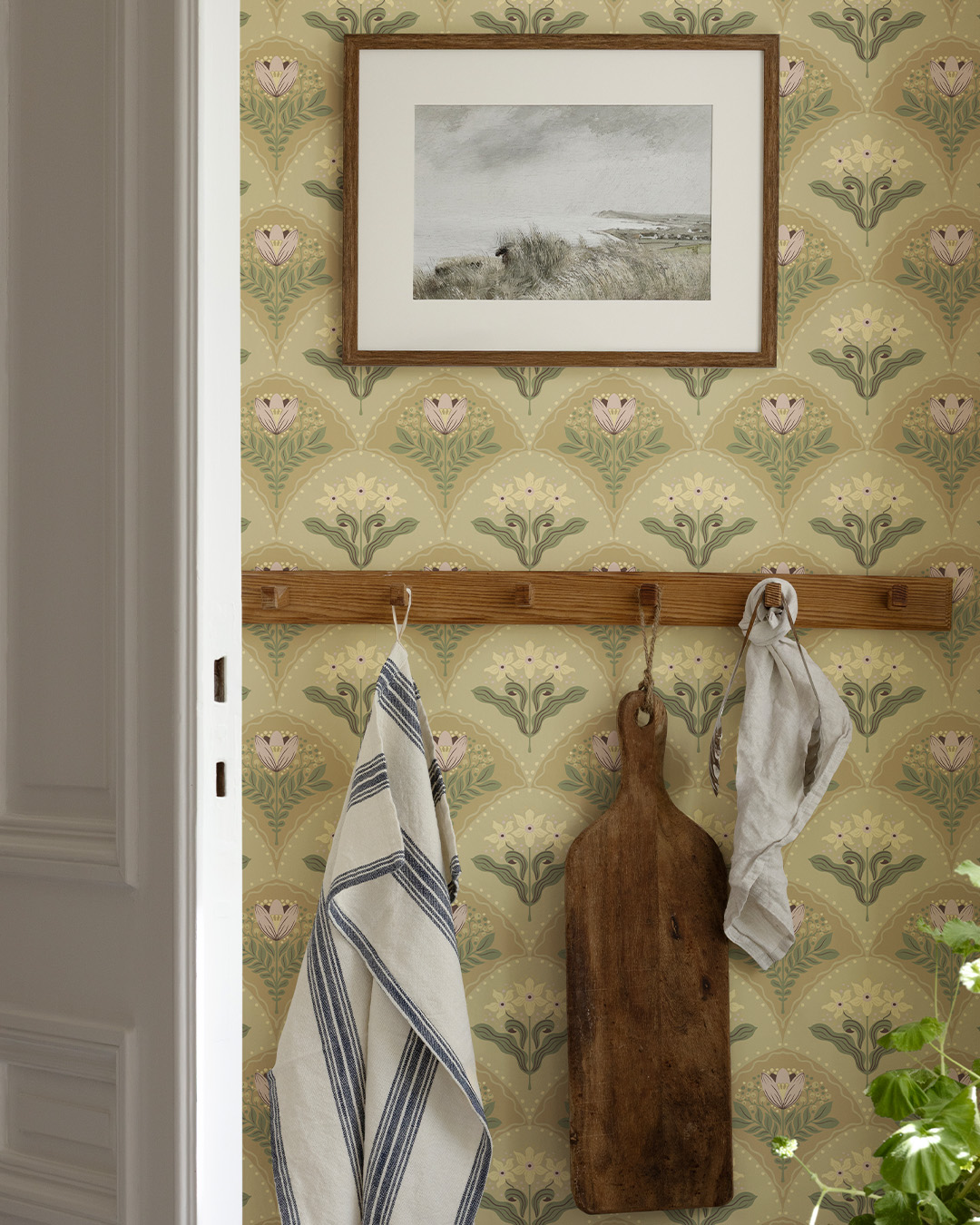 I kollektionen Saltviken har designern Lina Schnaufer jobbat med minnen från hennes gammelmormors föräldrahem i Kolmyrarna på västkusten. Huset är byggt någon gång under 1800-talet och var från början en enkel boning med tillhörande uthus och liten åker. Senare blev det fritidshus för de olika släktgrenarna under somrarna och loven. Huset kallas Saltvik efter viken som huset är beläget vid. Kollektionen Saltviken har tagit inspiration från Linas vistelser som barn och naturen runtomkring. Somrar som spenderades med hennes kusiner, cyklandes på smala barriga stigar ner till havet, plockandes blåbär och ätandes sillunch i bersån. En äkta sommardröm. Ljusbrun tapet med blommor i grönt, lila och ljusgult.