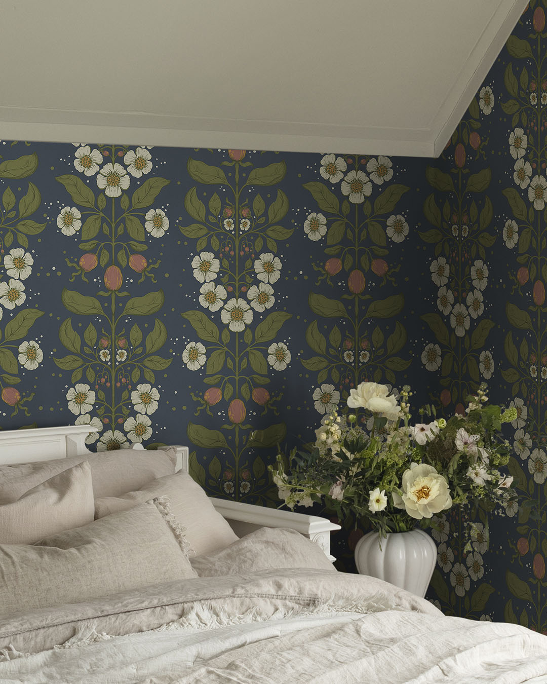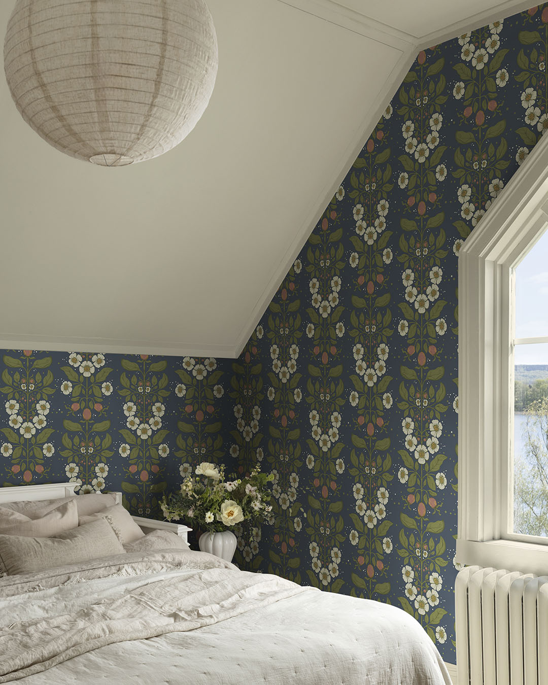 I kollektionen Saltviken har designern Lina Schnaufer jobbat med minnen från hennes gammelmormors föräldrahem i Kolmyrarna på västkusten. Huset är byggt någon gång under 1800-talet och var från början en enkel boning med tillhörande uthus och liten åker. Senare blev det fritidshus för de olika släktgrenarna under somrarna och loven. Huset kallas Saltvik efter viken som huset är beläget vid. Kollektionen Saltviken har tagit inspiration från Linas vistelser som barn och naturen runtomkring. Somrar som spenderades med hennes kusiner, cyklandes på smala barriga stigar ner till havet, plockandes blåbär och ätandes sillunch i bersån. En äkta sommardröm. Mörkblå tapet med nyponrosor i grönt, vinrött och vitt.
