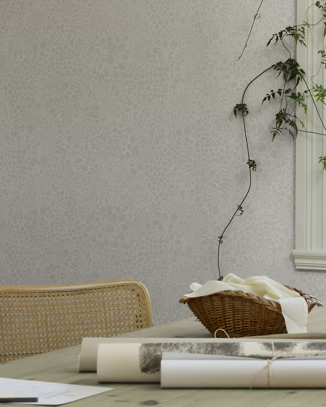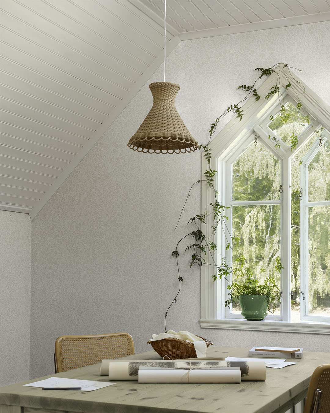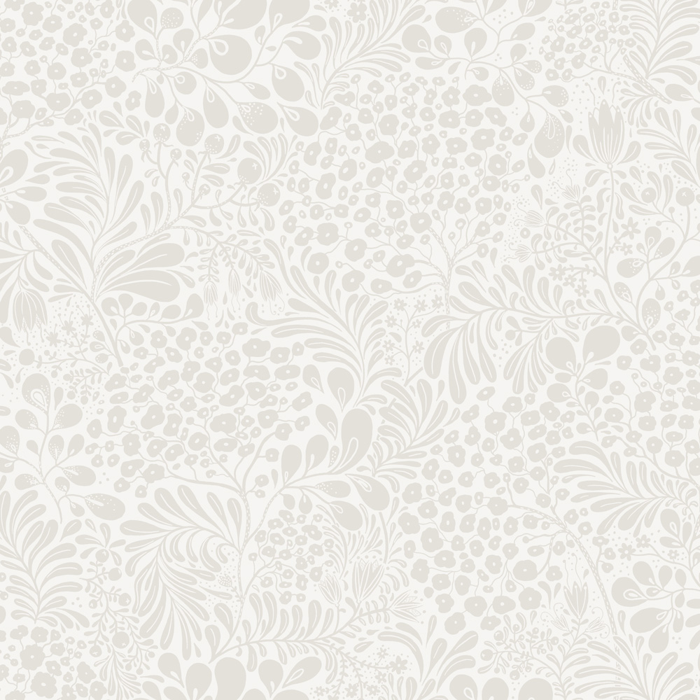 I kollektionen Saltviken har designern Lina Schnaufer jobbat med minnen från hennes gammelmormors föräldrahem i Kolmyrarna på västkusten. Huset är byggt någon gång under 1800-talet och var från början en enkel boning med tillhörande uthus och liten åker. Senare blev det fritidshus för de olika släktgrenarna under somrarna och loven. Huset kallas Saltvik efter viken som huset är beläget vid. Kollektionen Saltviken har tagit inspiration från Linas vistelser som barn och naturen runtomkring. Somrar som spenderades med hennes kusiner, cyklandes på smala barriga stigar ner till havet, plockandes blåbär och ätandes sillunch i bersån. En äkta sommardröm. Vit tapet med ljusgrått slingrande blommönster.