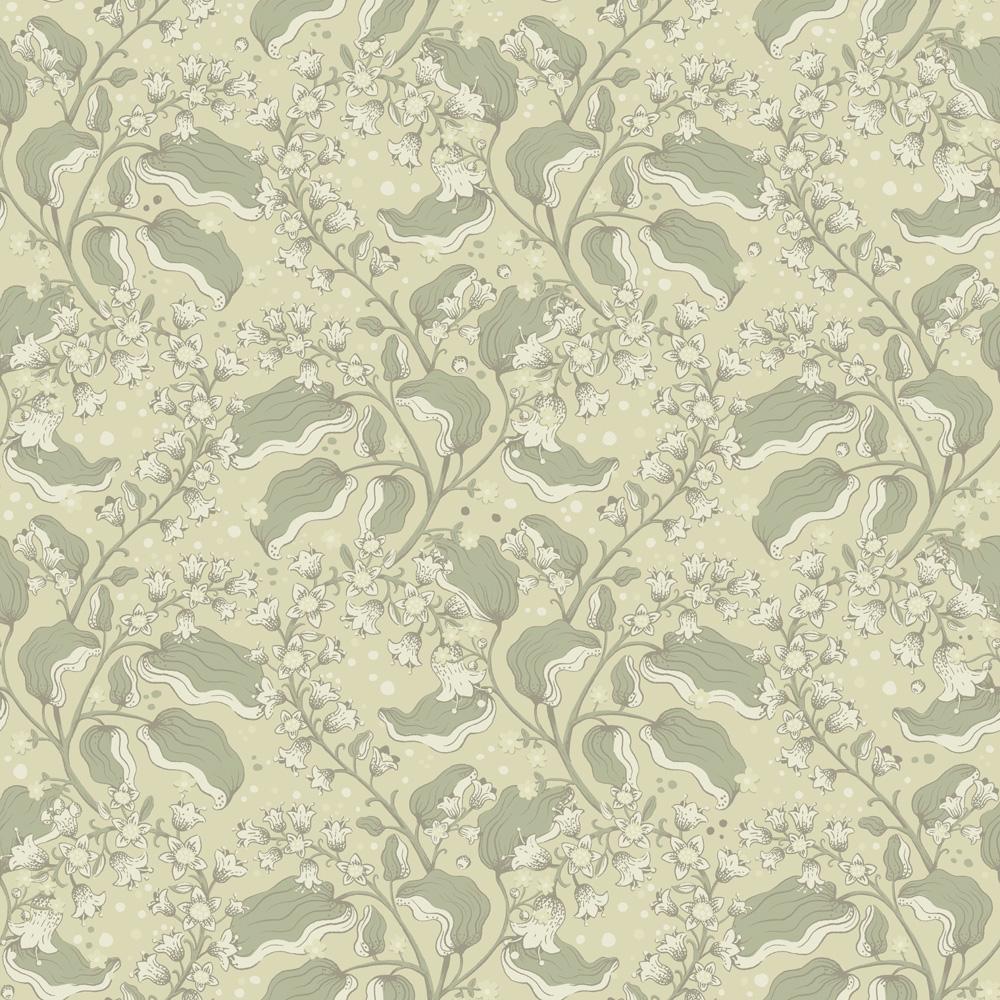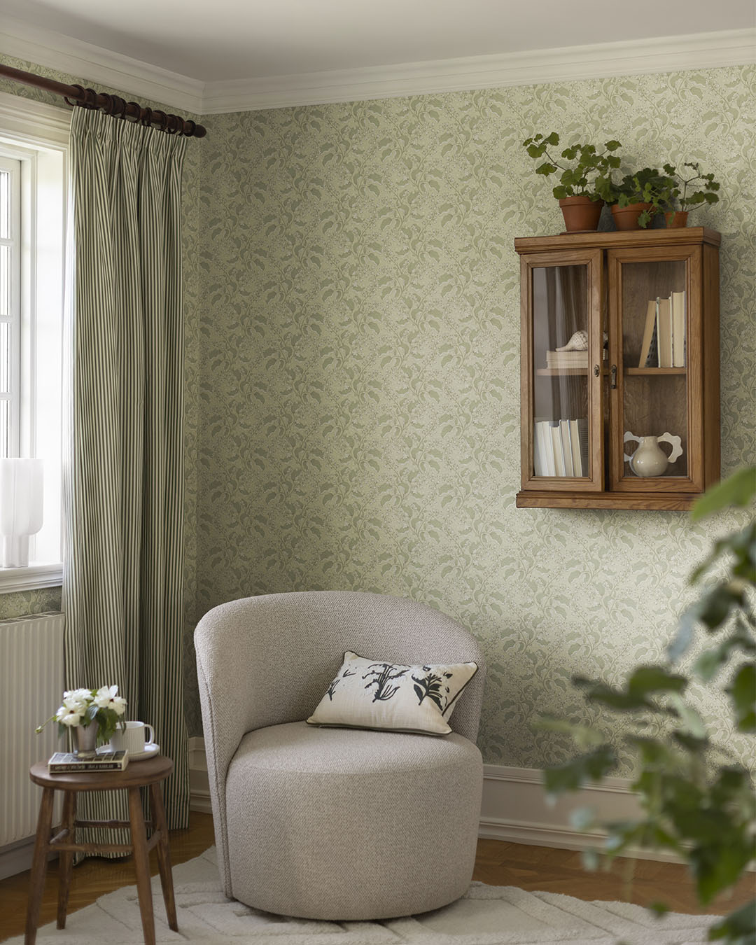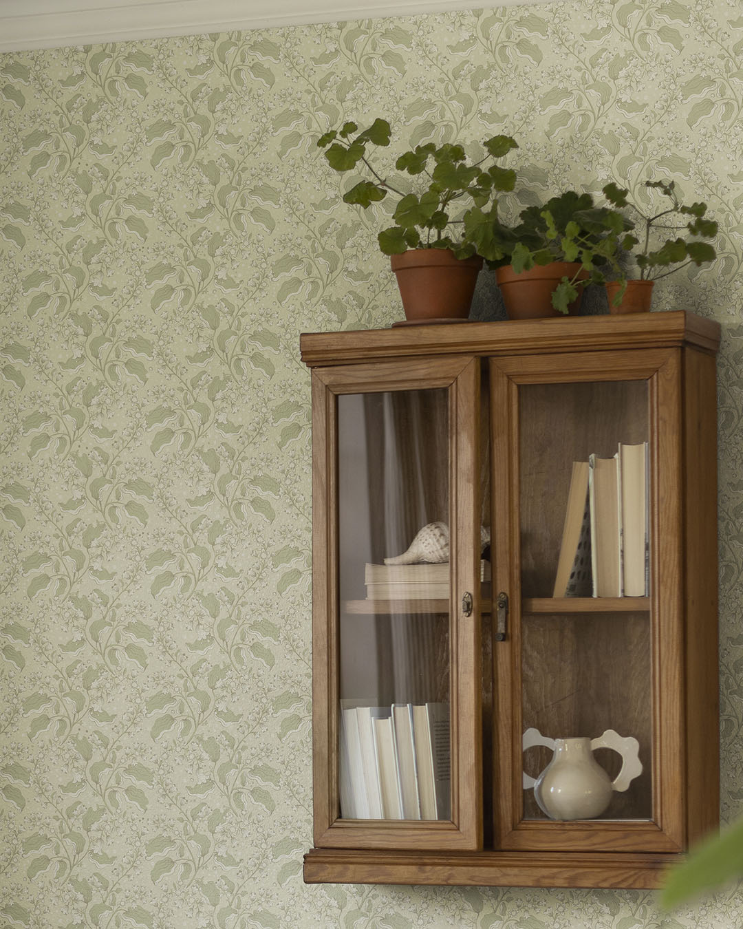 I kollektionen Saltviken har designern Lina Schnaufer jobbat med minnen från hennes gammelmormors föräldrahem i Kolmyrarna på västkusten. Huset är byggt någon gång under 1800-talet och var från början en enkel boning med tillhörande uthus och liten åker. Senare blev det fritidshus för de olika släktgrenarna under somrarna och loven. Huset kallas Saltvik efter viken som huset är beläget vid. Kollektionen Saltviken har tagit inspiration från Linas vistelser som barn och naturen runtomkring. Somrar som spenderades med hennes kusiner, cyklandes på smala barriga stigar ner till havet, plockandes blåbär och ätandes sillunch i bersån. En äkta sommardröm. Ljusgrön tapet med syrenkvistar i grönt och vitt.