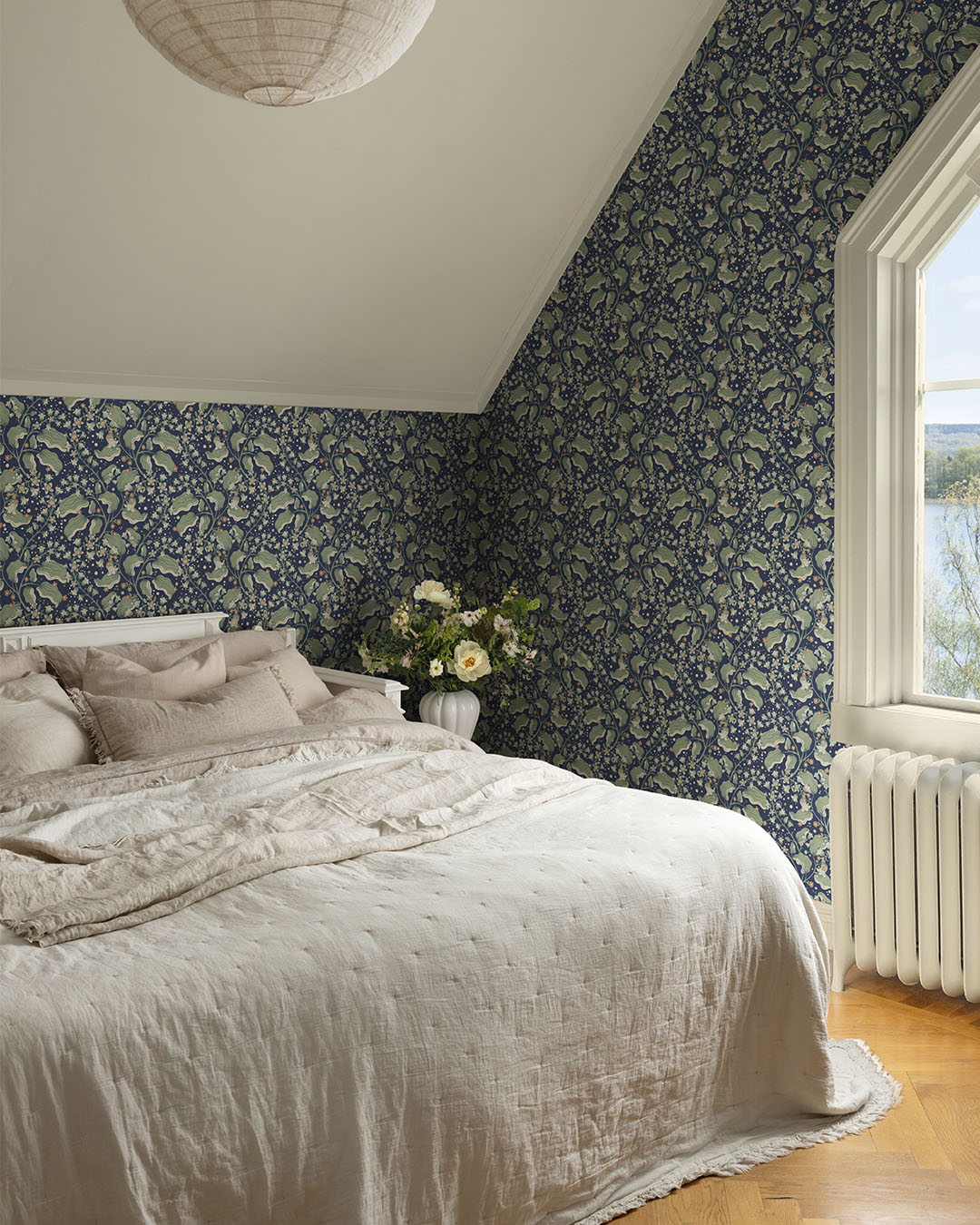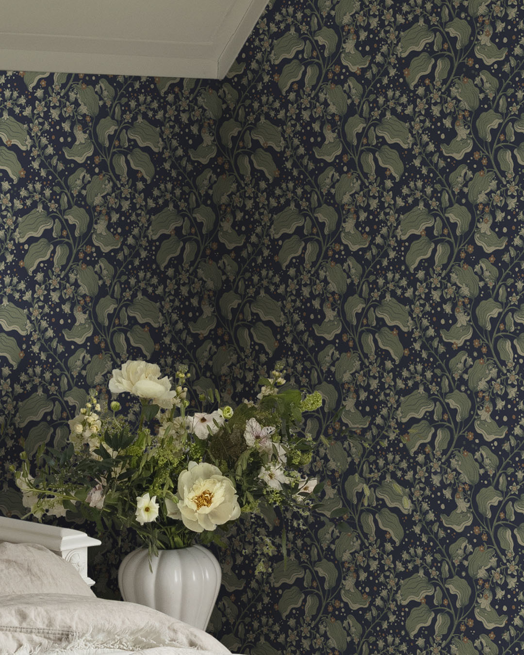 I kollektionen Saltviken har designern Lina Schnaufer jobbat med minnen från hennes gammelmormors föräldrahem i Kolmyrarna på västkusten. Huset är byggt någon gång under 1800-talet och var från början en enkel boning med tillhörande uthus och liten åker. Senare blev det fritidshus för de olika släktgrenarna under somrarna och loven. Huset kallas Saltvik efter viken som huset är beläget vid. Kollektionen Saltviken har tagit inspiration från Linas vistelser som barn och naturen runtomkring. Somrar som spenderades med hennes kusiner, cyklandes på smala barriga stigar ner till havet, plockandes blåbär och ätandes sillunch i bersån. En äkta sommardröm. Mörkblå tapet med syrenkvistar i grönt, creme och ljusbrunt.