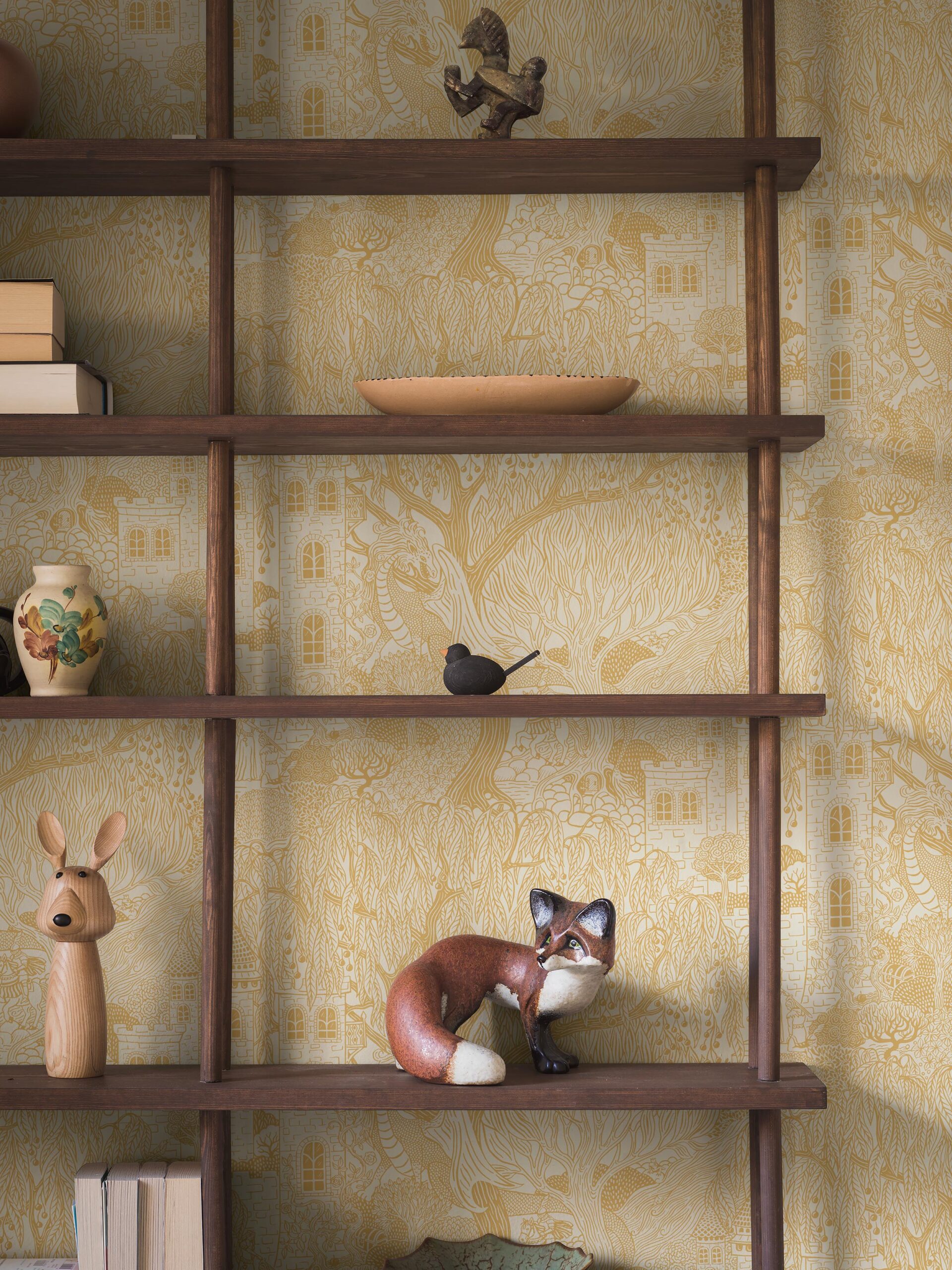 Välkommen till Kingdom of the Willow! I skydd av det susande pilträdet ligger sagoslottet och vid en närmare titt ser du också riddaren, prinsessan och den väldiga draken. En magisk barntapet som inspirerar till härliga lekar och berättelser! Här är tapeten Kingdom of the Willows handritade mönster limtryckt i en glad, gul nyans på vår äggskalsvita Pigment-botten.