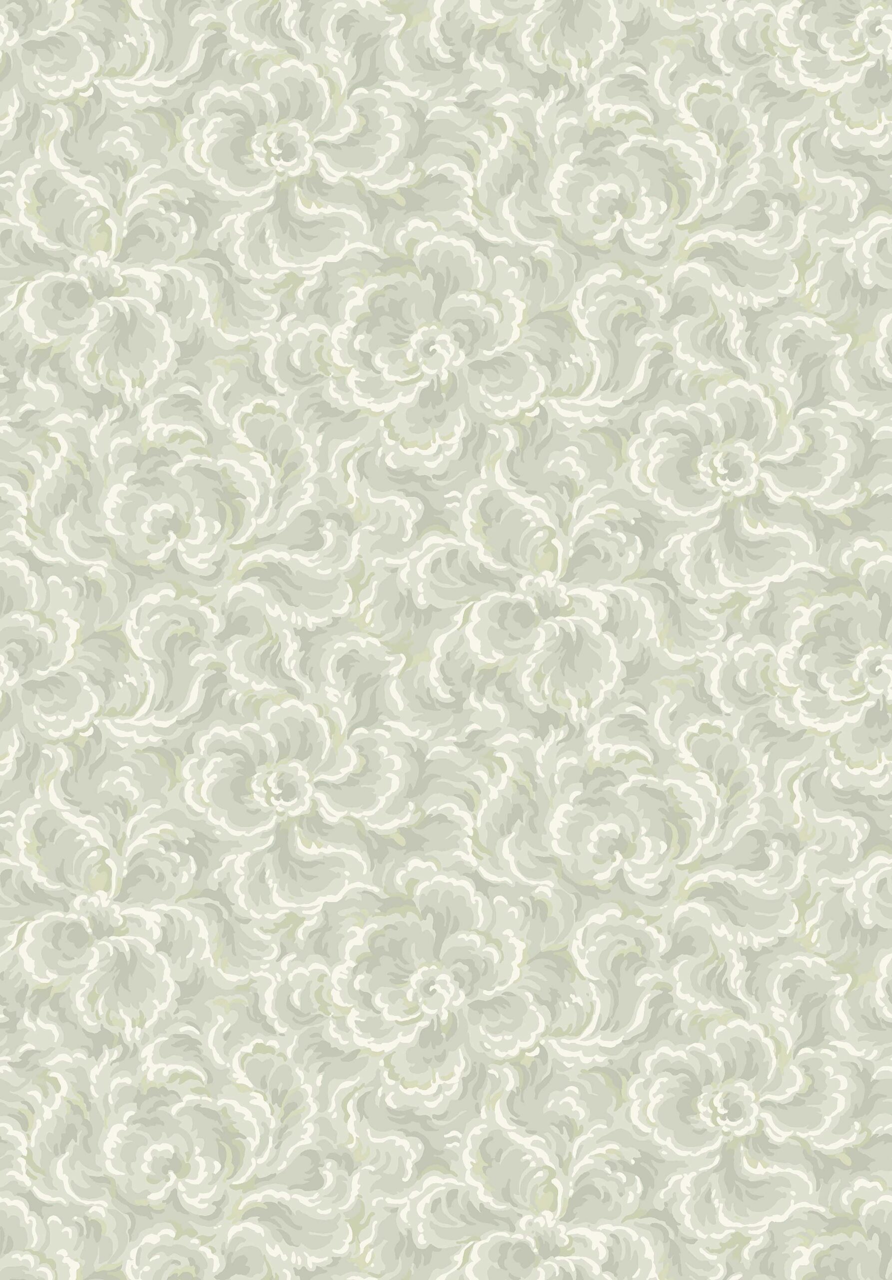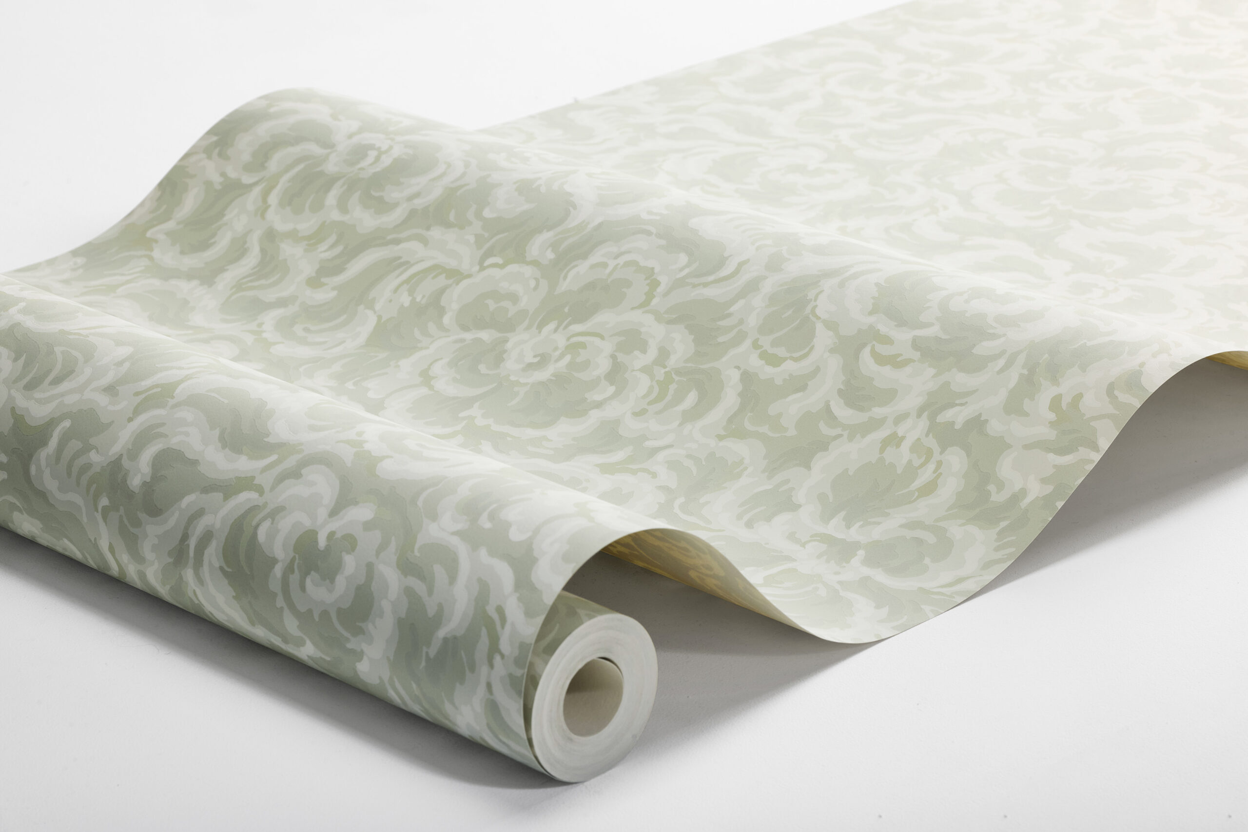 Tapeten Änggårdens abstrakta, lite diffusa mönster för tankarna till en fluffig molnhimmel, och den gör sig lika bra på vägg som i tak. Det målade originalet i vårt arkiv är troligtvis från 1930-talet, en tid då modernismen förespråkade diskreta tapeter som neutral fond till övrig inredning. Därmed blev mönstrade tapeter utan motiv, men med mycket karaktär, väldigt populära. Här är tapeten Änggården limtryckt i en mild och behaglig grön färgskala med vita detaljer.