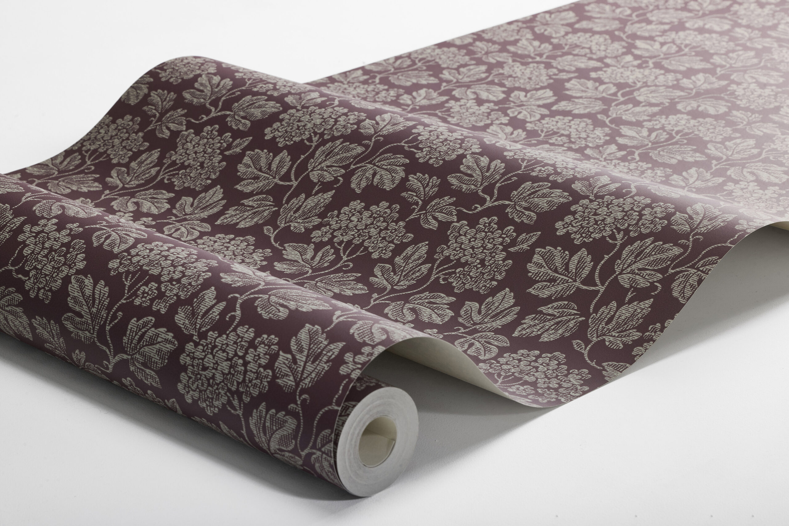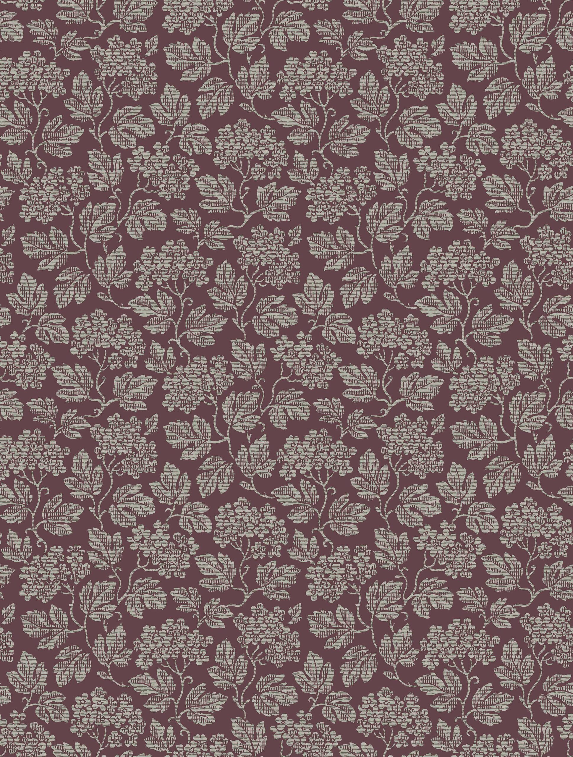 På gobelängtapeten Hagtorn står hagtornen i full blom och täcker ytan med sina ymniga blomklasar och vackert flikiga blad. I mönstret finns en diskret randning som efterliknar textil, ett grepp som ger denna tapet ett ombonat, klätt uttryck. Mönstret är hämtat från vårt arkiv och kommer gissningsvis från perioden 19151920 då denna typ av tapeter blev omåttligt populära som motvikt till jugendstilens ljusa, luftiga ideal. Här ser du tapeten Hagtorn med gråbeige detaljer på en dovt plommonlila, nästan vinröd botten. På håll smälter det täta bladverket ihop till en lugn, enhetlig yta.