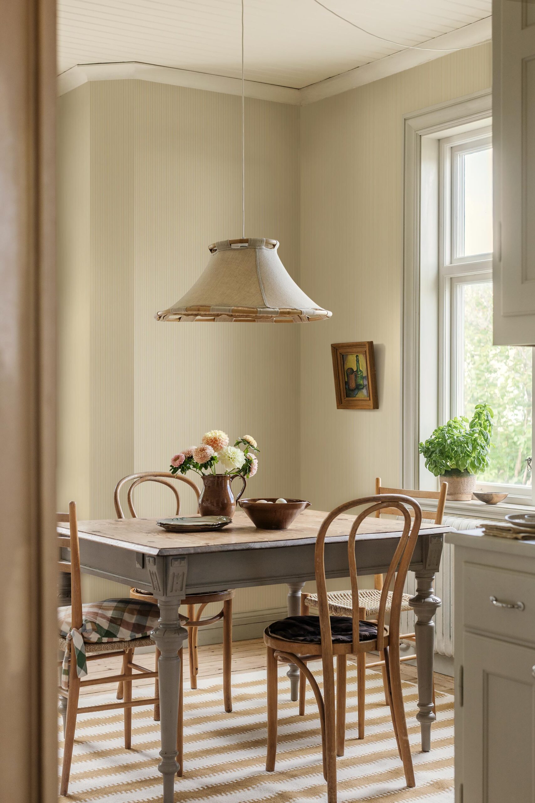 Sam är en tidlös, smalrandig tapet som limtrycks på traditionellt vis för en matt, levande yta med handmålad karaktär. De olika breda ränderna ger det annars strikta mönstret en lekfull lätthet. Här ser du tapeten Sam i en mild, smörgul färgställning med ränder i vitt, blekgult och lite mörkare gult som drar brunt. På håll flyter mönstret samman till en vilsam helhet.