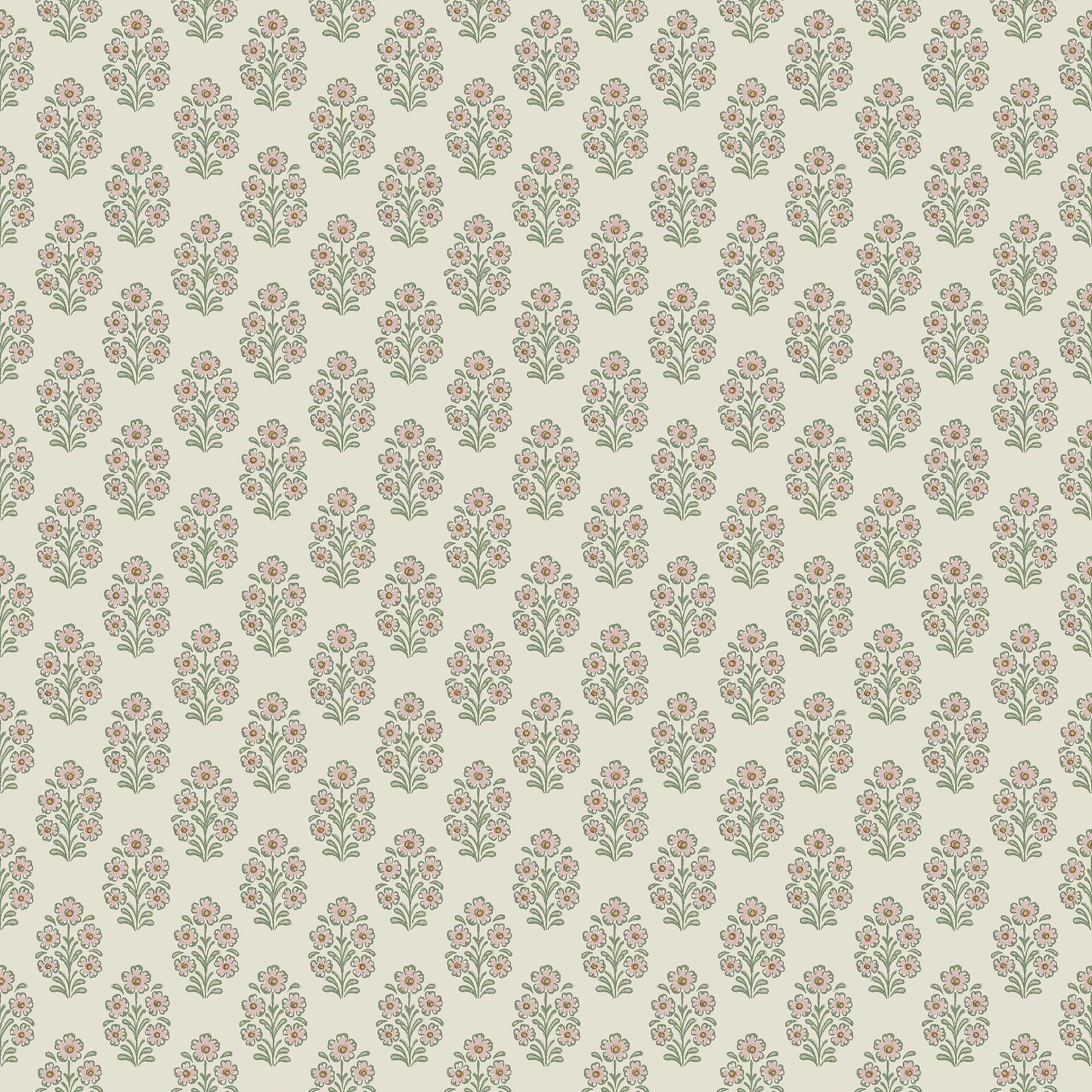 Sibylla är en söt, småblommig tapet som här går i en romantisk och hemtrevlig färgskala; blekrosa blommor med aprikos mitt och blad i milda, gröna toner på cremevit botten. Mönstret är nyritat men har tydliga likheter med forna tiders blocktryck. På håll flyter Sibyllas rytmiska mönsterbild ihop till en harmonisk helhet. En tidlös och trivsam tapet med lantlig charm.