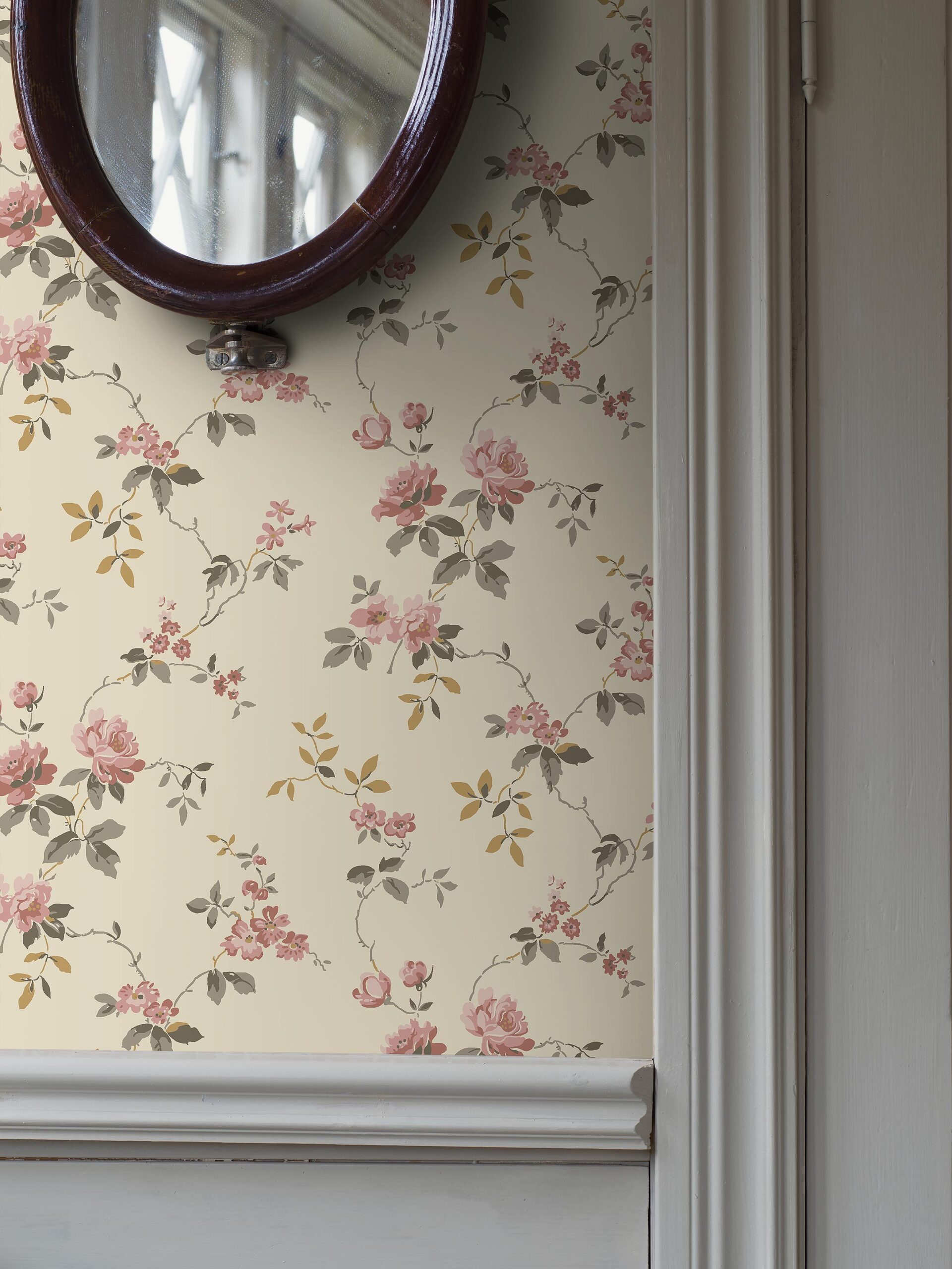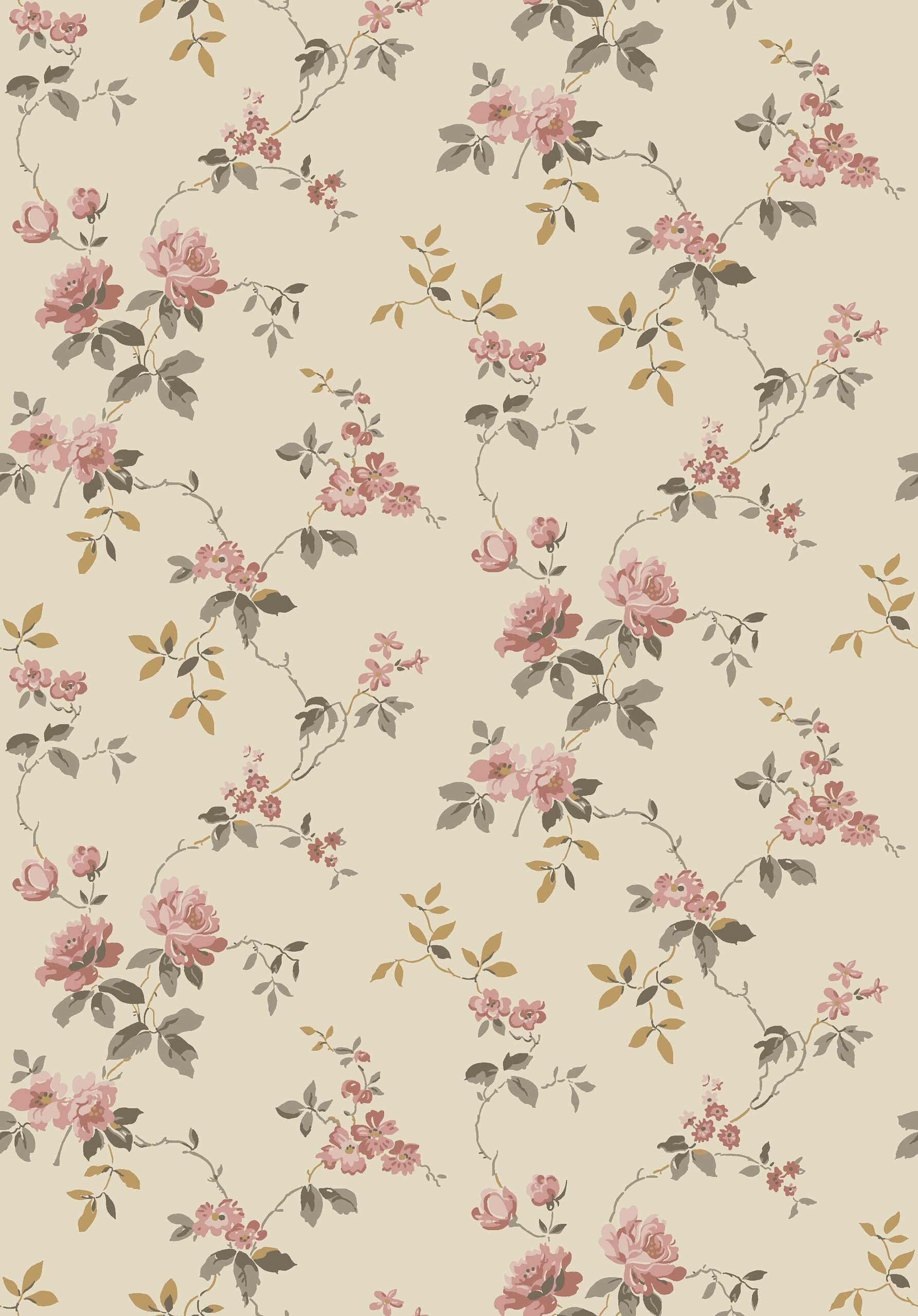 Värmdö är en romantisk, blommig tapet, återskapad efter ett original från 1920-talet. Det luftiga, söta mönstret med slingrande rosor kommer från Nordiska muséets samlingar och är typiskt för just denna tidsperiod. Tapeten satt tidigare i Villa Bråvalla, en sommarvilla utanför Gustavsberg på Värmdö. Här ser du den ljusa tapeten Värmdö i originalets färgställning, med gråbrunt och gulbrunt bladverk och rosor i olika rosa nyanser på cremefärgad botten.