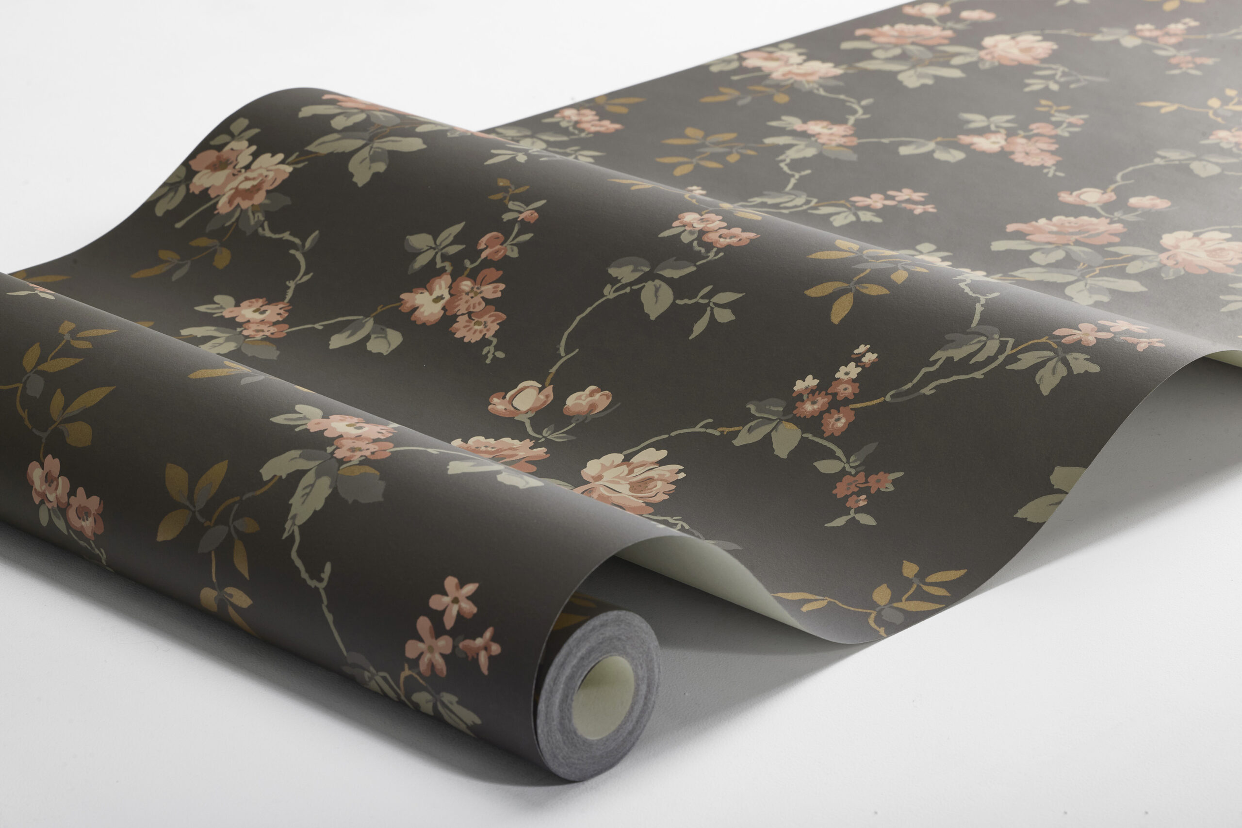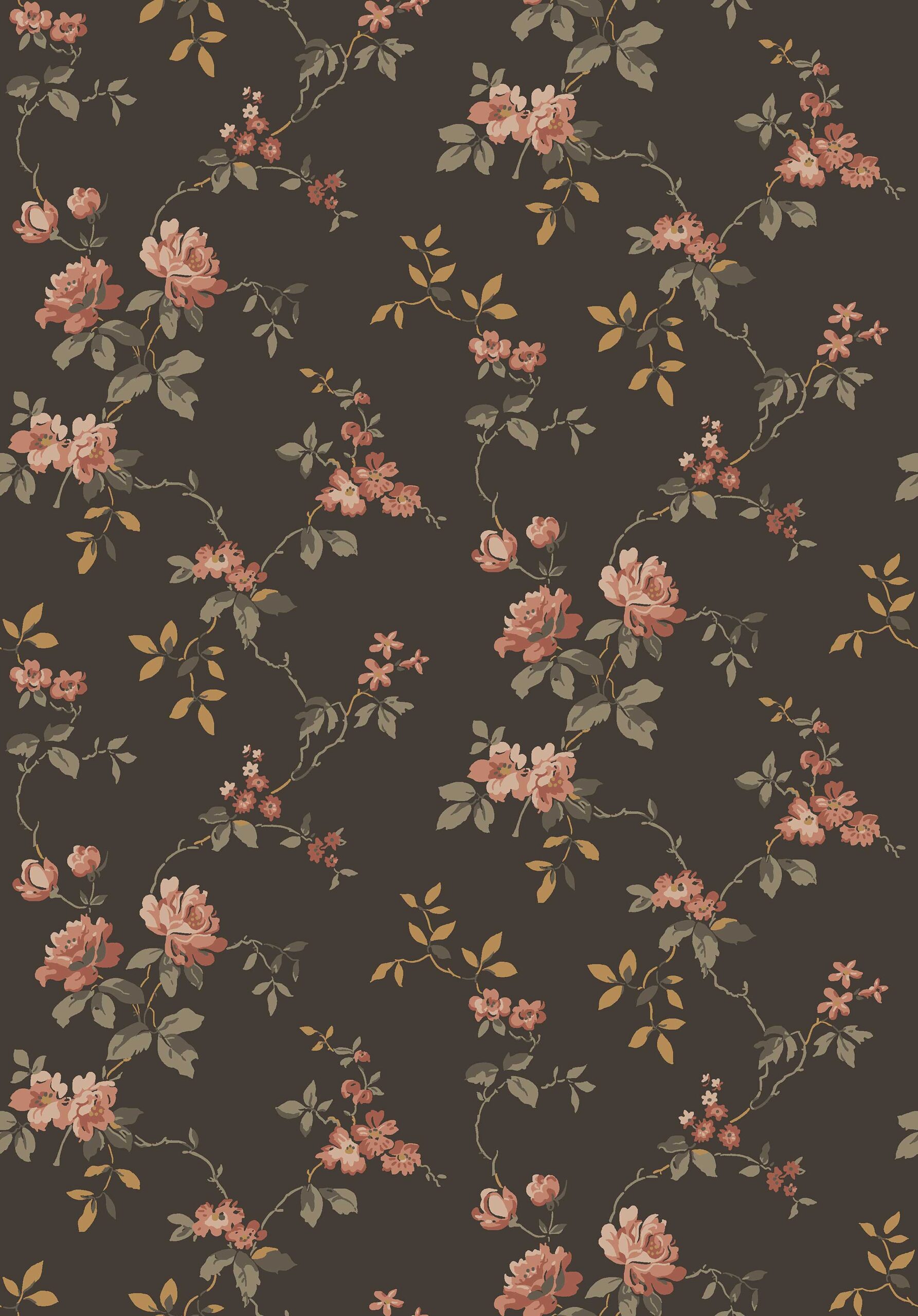 Över den mörka, blommiga tapeten Värmdö slingrar ett luftigt mönster av näpna rosor i rött och rosa. Mönstret är från 1920-talet, och finns bevarat i Nordiska muséets samlingar. Rosor i olika stilar var ett mycket populärt motiv under denna period, och just denna tapet satt i sommarvillan Villa Bråvalla på Värmdö. Här är tapeten Värmdö limtryckt i en mörk, ganska dramatisk palett där rosorna lyser i varma toner av rött och rosa mot en mörkbrun, nästan svart botten. Det slingrande bladverket går i gråbrunt och skimrande koppar, vilket ger en vacker effekt när ljuset vandrar över väggen.