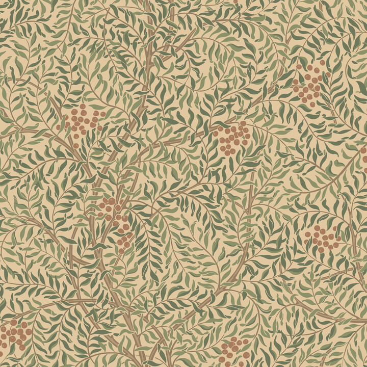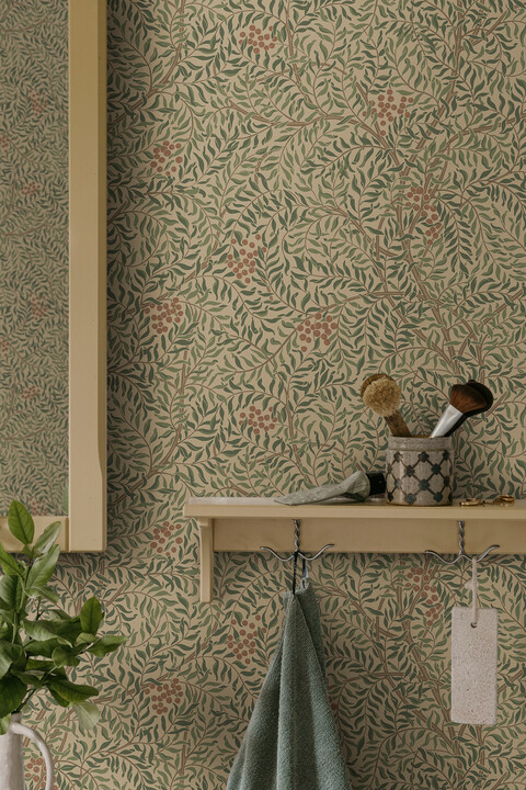 Harmoniskt limtryckt mönster med detaljrikt grenverk av Rönnbär som i sitt stiliserade uttryck ger en hemtrevlig och omslutande känsla. Färgställningen Garden Green har livfulla toner av varm beige, brun, mjuk terrakotta och trädgårdsgröna nyanser. Designad av Karolina Kroon