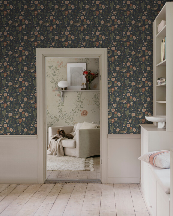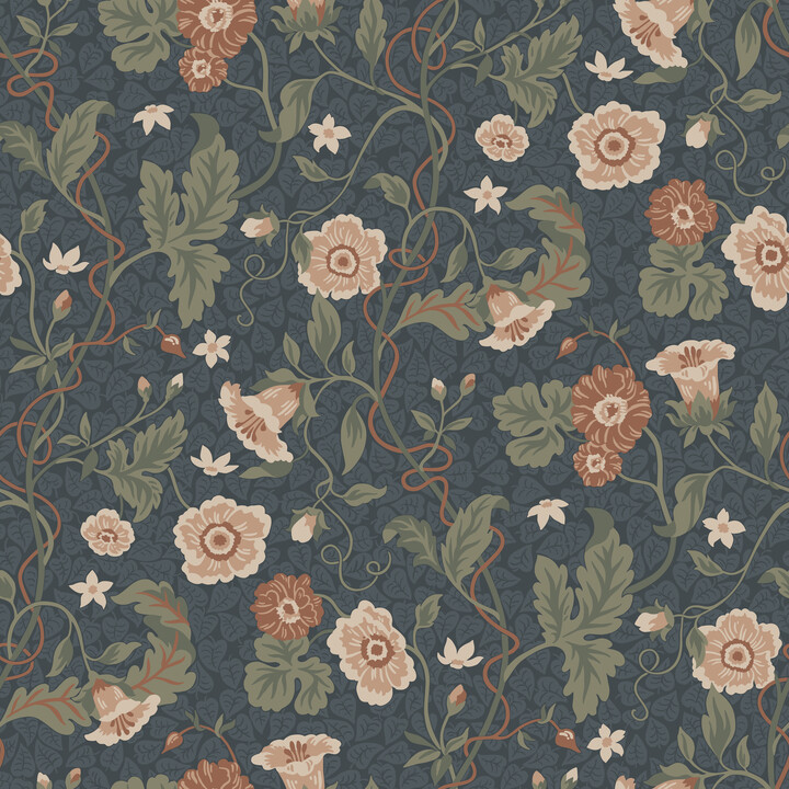 Japanska anemoner, vinrankor i form av koppar och sugkoppar och flätade avenyer ger en mjukt grön Arts & Crafts-inspirerad tapet med intrikata detaljer och en omslutande karaktär. Detta underbara romantiska mönster skapades i samarbete med @lovisaslind. Ulla, Midnight Blue, har trädgårdsgrönt och terrakottaröda nyanser på en midnattsblå botten. Designad av Sara Bergqvist