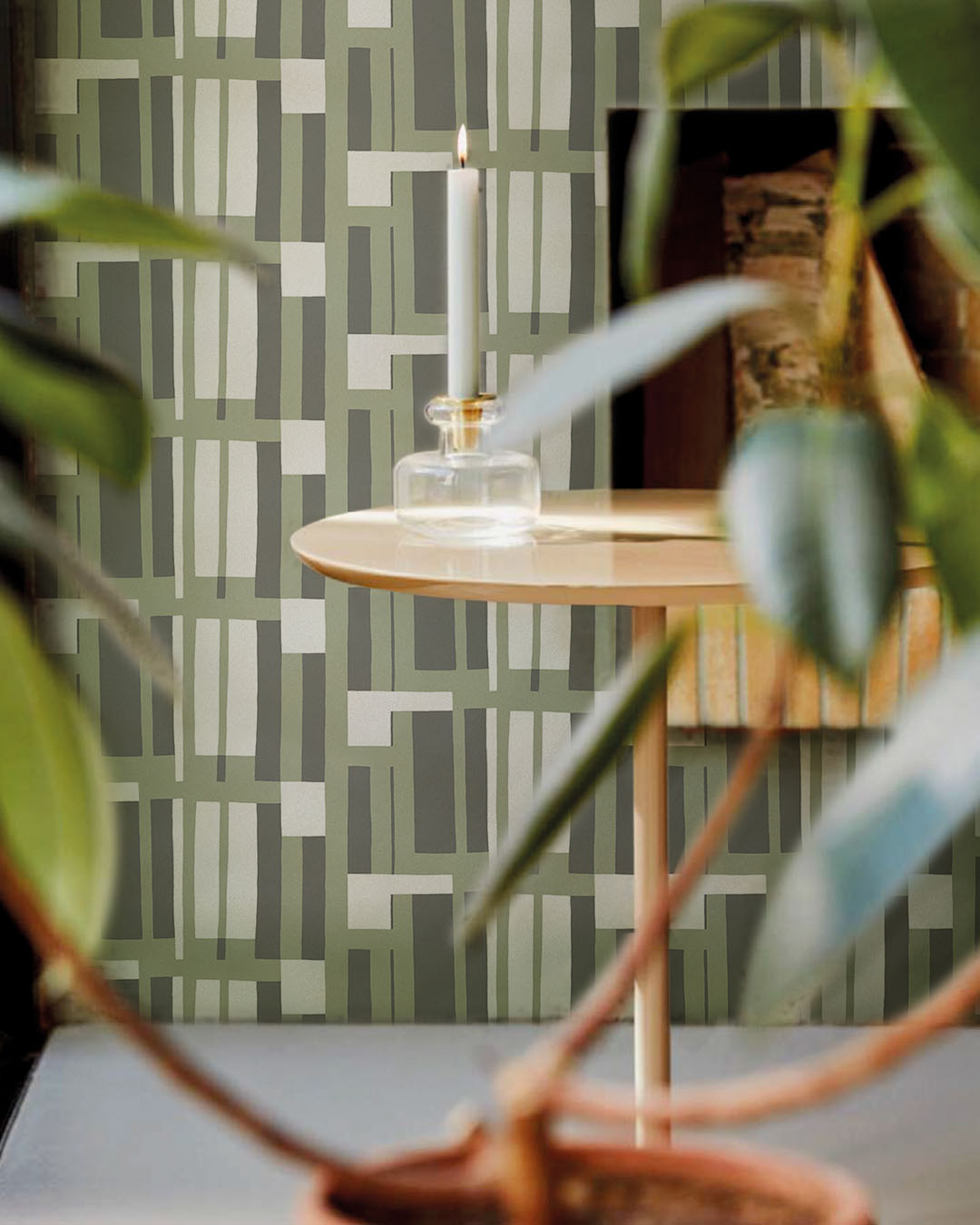 Ett nytt och spännande urval av tapeter från Marimekko bjuder på ett mångsidigt kollage av karaktäristiska tryck och nya mönster från designers som Maija Isola, Aino-Maija Metsola och Carina Seth Andersson. I kollektionen ser vi uttrycksfulla mönster i svala jordnära färger. Marimekko beskriver deras hantverk som en frisinnad lekplats av kreativitet där djärva tryck och färger kommer till liv. Tapet med geometriskt mönster i vitt och grått mot en grön botten från Marimekko med mönsternamn ”Attika”