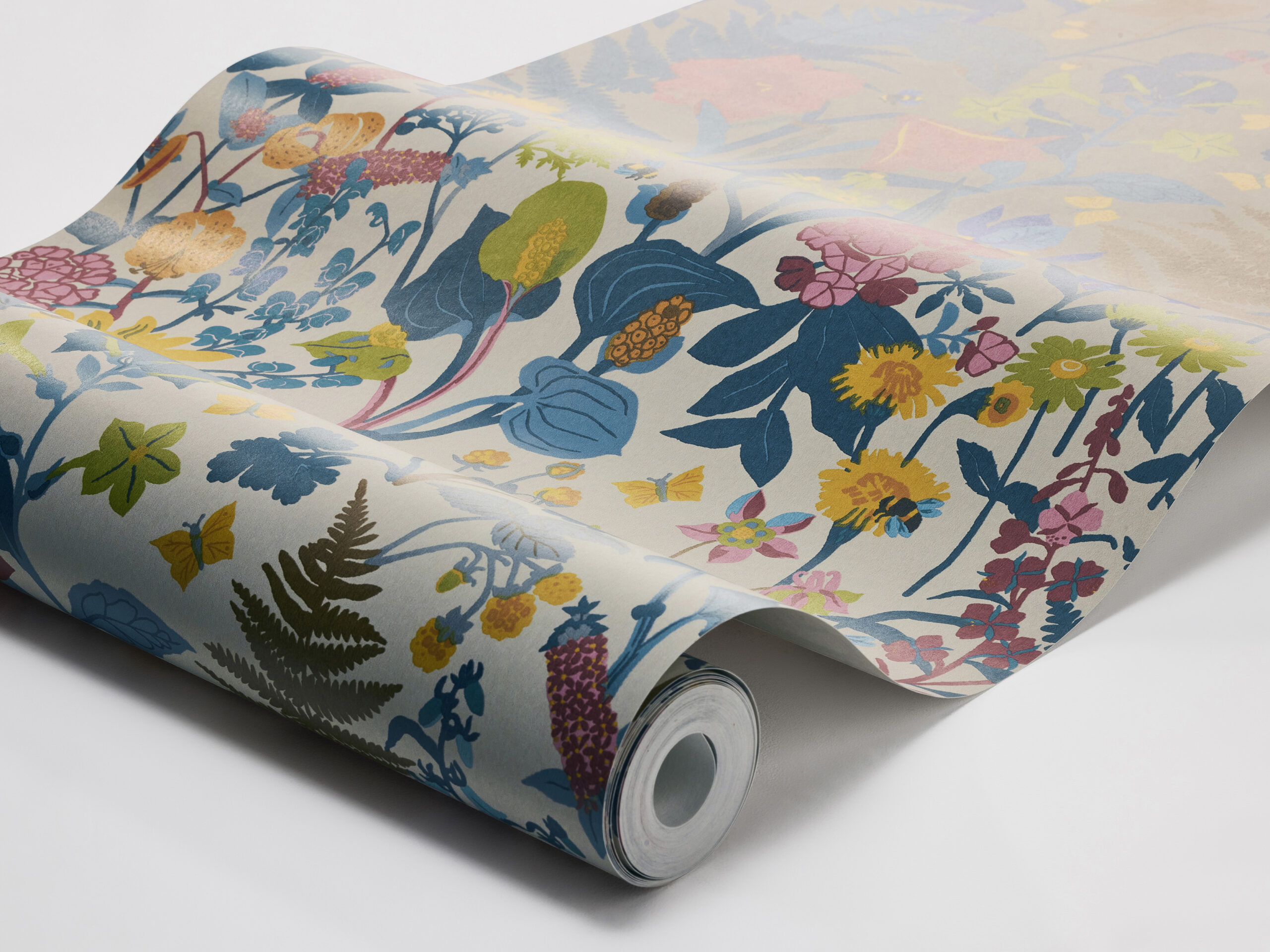 Textilkonstnären Gocken Jobs ritade sitt livfulla mönster Stugrabatt med inspiration från sin brors trädgård och sina egna blomskisser från Italien. Bjärta toner av gult, grönt, orange, rött och rosa i ett bladverk i grått, blått och brunt. Just färgskalan gör detta prunkande blommönster helt unikt – det innehåller 25 färger! Nu trycker vi Gocken Jobs färgglada Stugrabatt från 1951 som tapet. Här på linnebeige botten, likt det original som än i dag trycks på textil av Jobs Handtryck i Leksand.