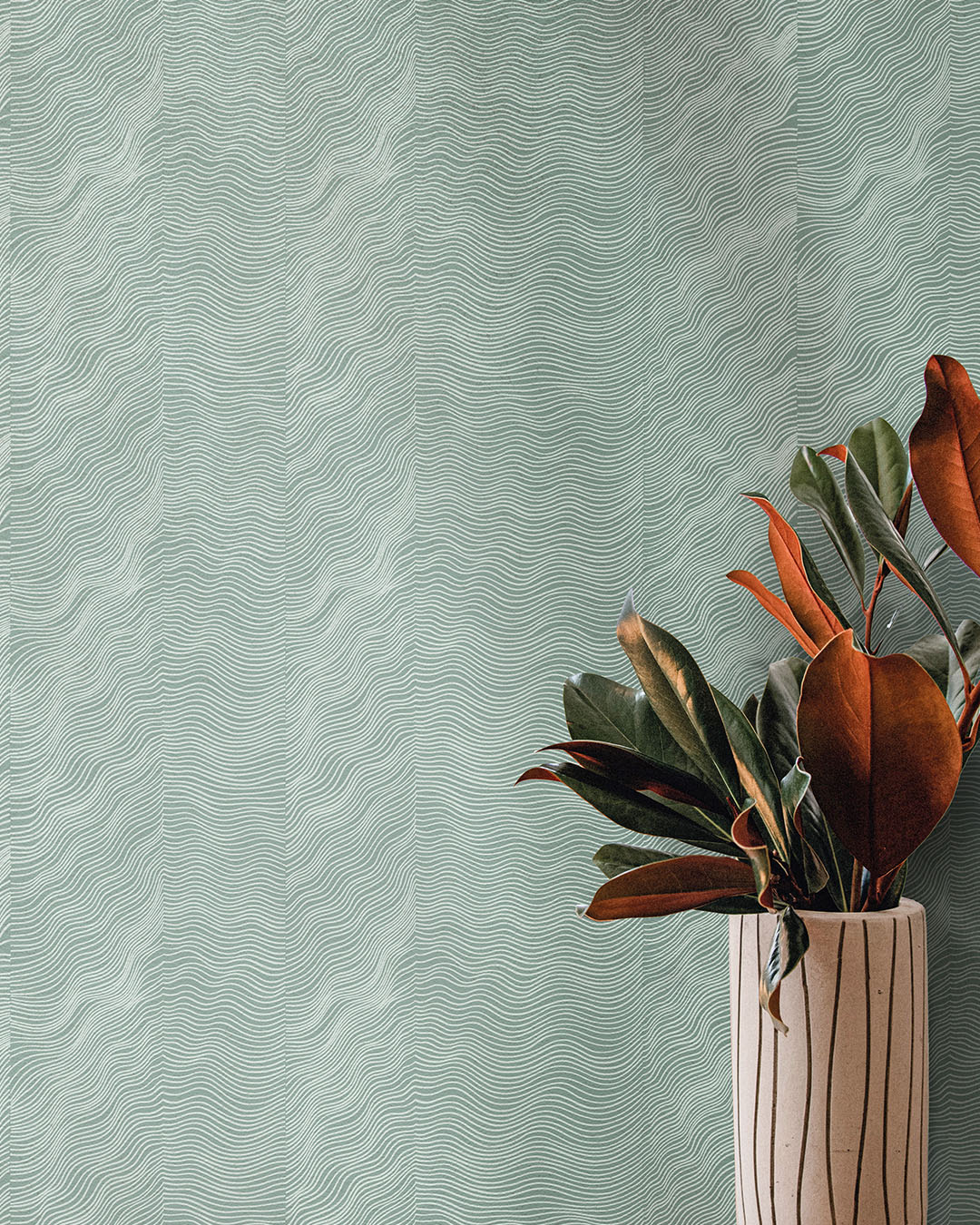 Ett nytt och spännande urval av tapeter från Marimekko bjuder på ett mångsidigt kollage av karaktäristiska tryck och nya mönster från designers som Maija Isola, Aino-Maija Metsola och Carina Seth Andersson. I kollektionen ser vi uttrycksfulla mönster i svala jordnära färger. Marimekko beskriver deras hantverk som en frisinnad lekplats av kreativitet där djärva tryck och färger kommer till liv. Tapet med vågigt mönster i turkos från Marimekko med mönsternamn ”Näkki”