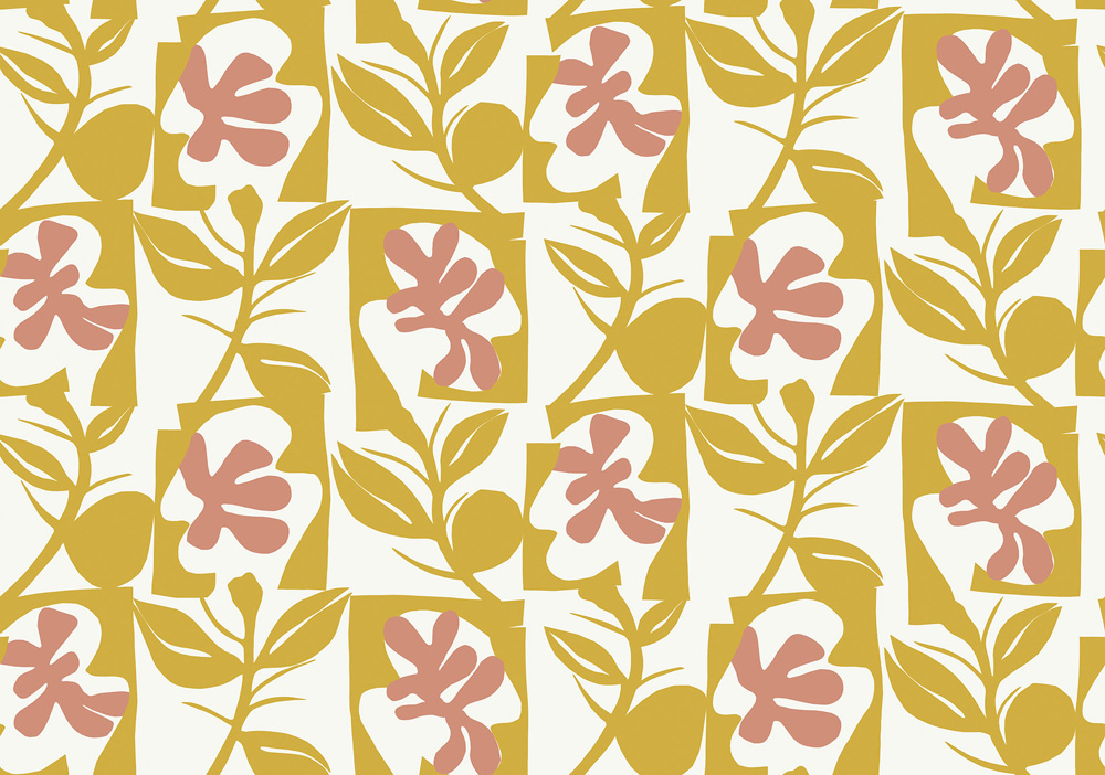 Ett nytt och spännande urval av tapeter från Marimekko bjuder på ett mångsidigt kollage av karaktäristiska tryck och nya mönster från designers som Maija Isola, Aino-Maija Metsola och Carina Seth Andersson. I kollektionen ser vi uttrycksfulla mönster i svala jordnära färger. Marimekko beskriver deras hantverk som en frisinnad lekplats av kreativitet där djärva tryck och färger kommer till liv. Tapet med retro blommönster i gult och rosa mot en varm botten från Marimekko med mönsternamn ”Pienet Naatit”