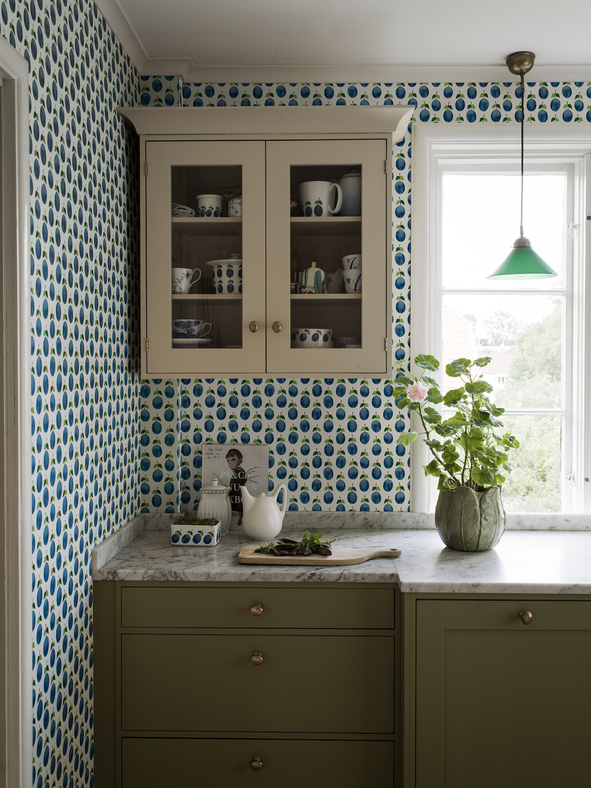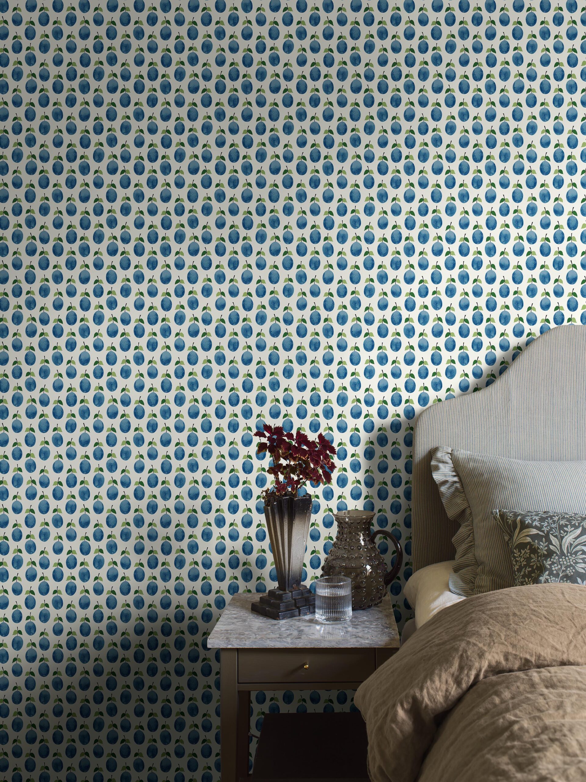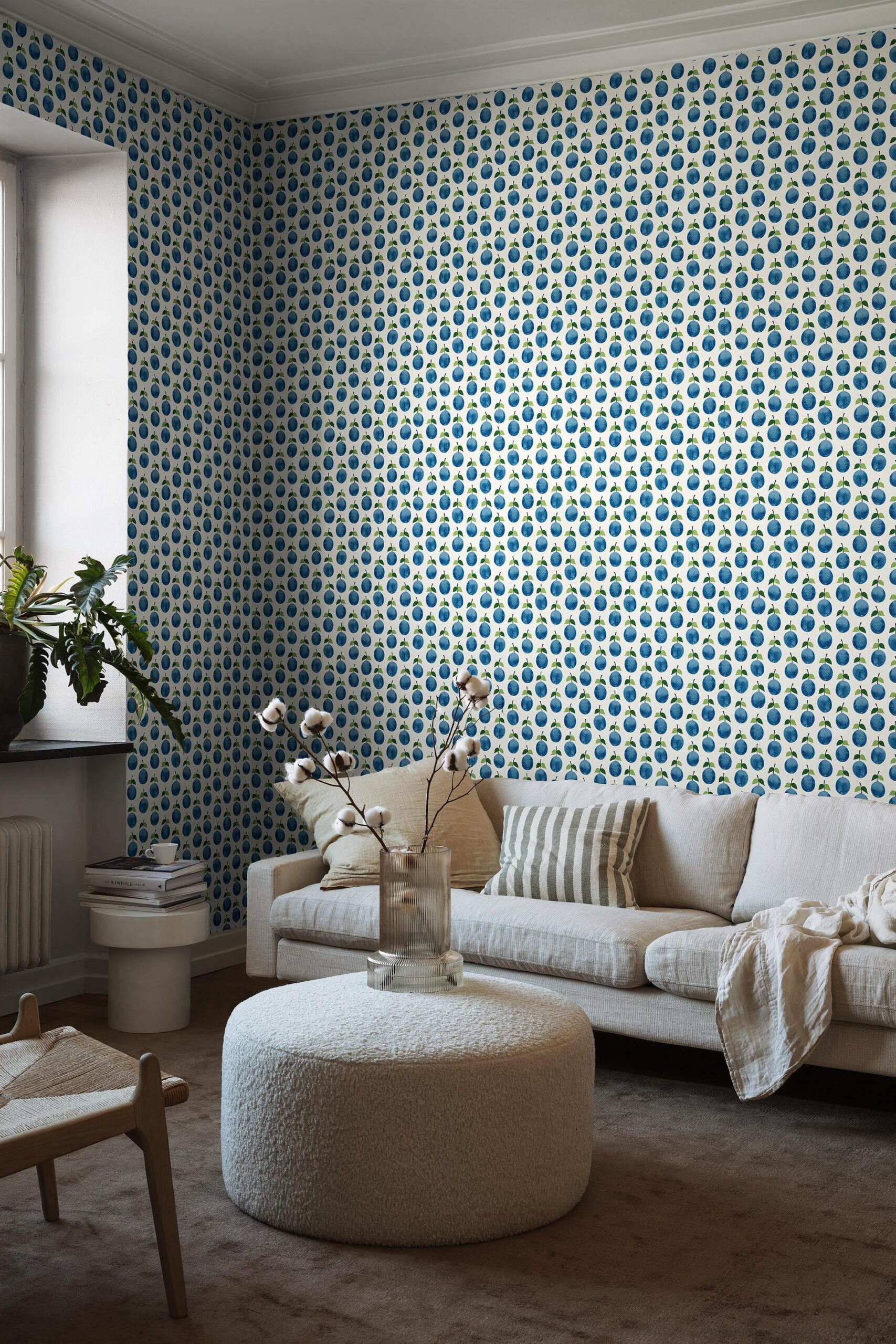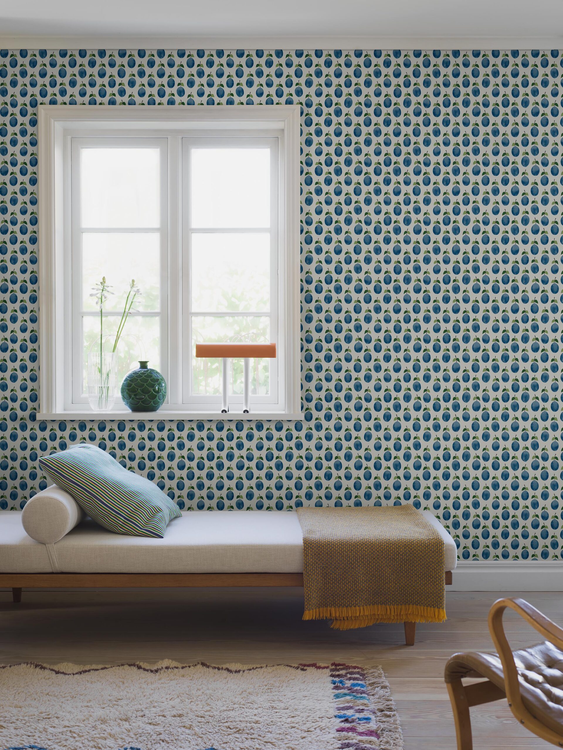 Konstnären Stig Lindbergs stiliserade plommonmönster Prunus finns på koppar och fat i många svenska hem. Mönstret skapades 1962 för anrika Gustavsbergs Porslinsfabrik, och nu kan du få Lindbergs plommon på väggen också. En grafisk designklassiker som i samarbete med Stigs son Lars Lindberg nu trycks som tapet. Här ser du Prunus med himmelsblå plommon och detaljer i grönt och brunt på vit botten. En härlig tapet för till exempel kök och matplats.