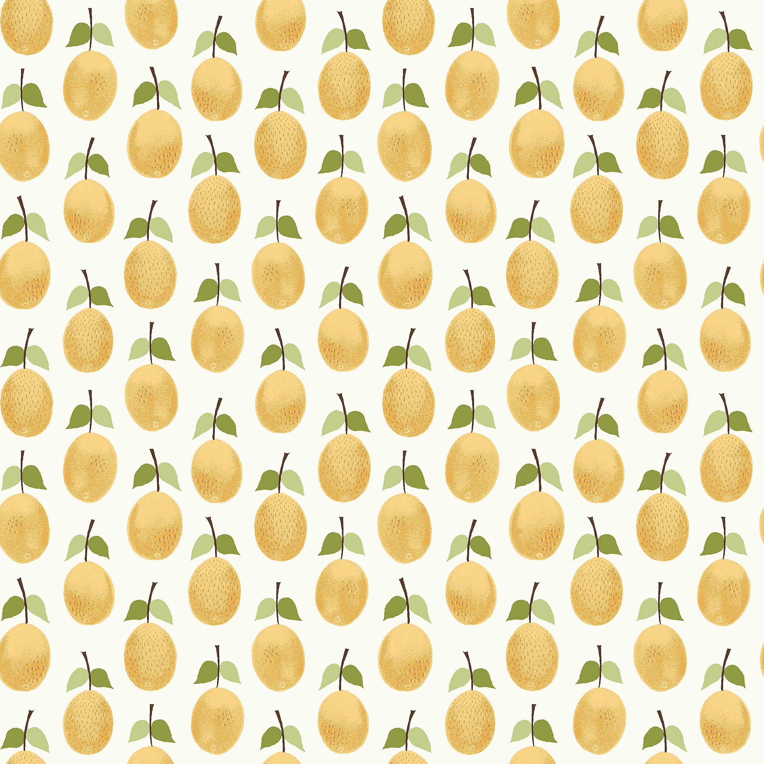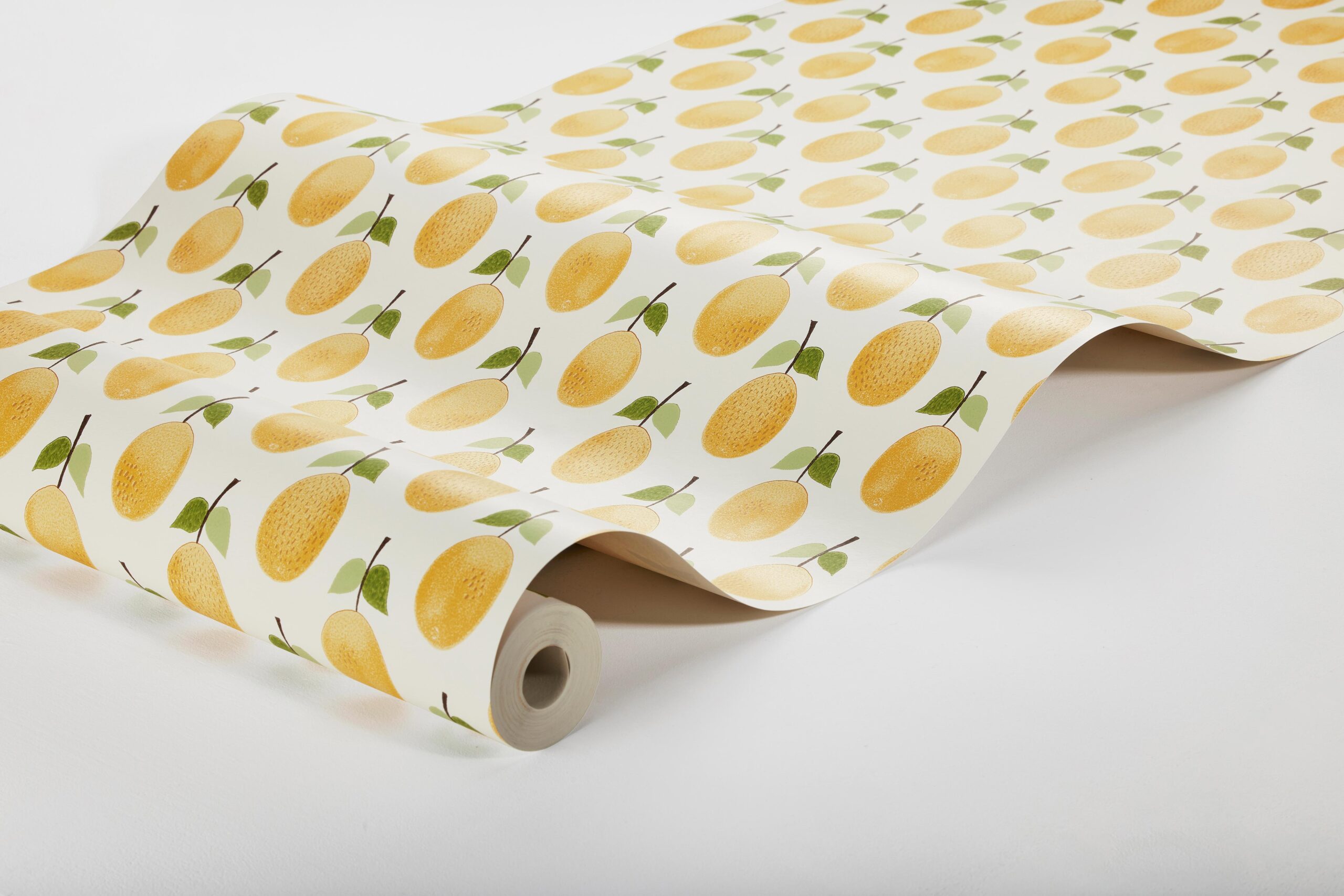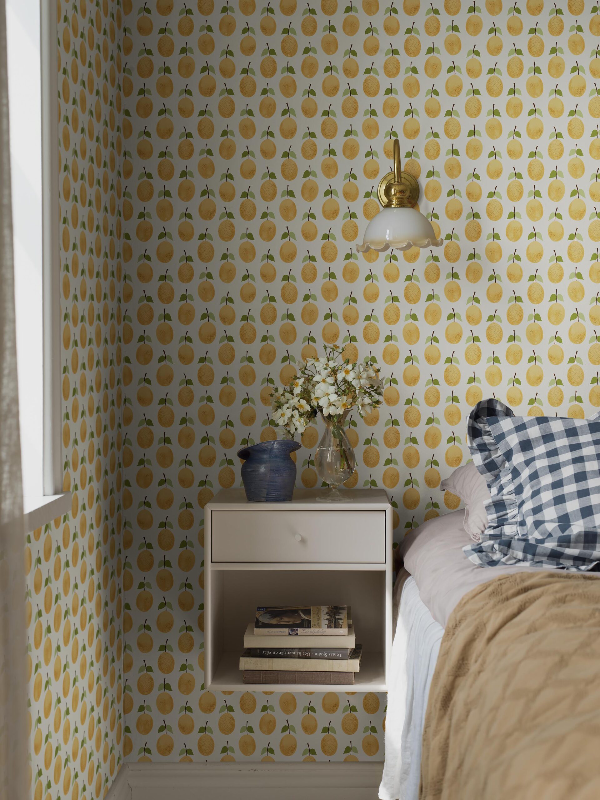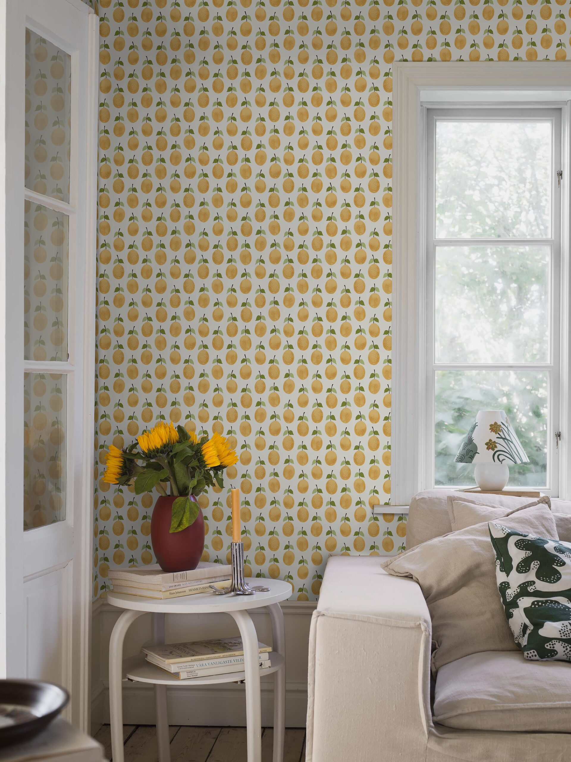 Prunus är ett älskat mönster signerat tusenkonstnären Stig Lindberg. De stiliserade plommonen har prytt koppar och fat i många hem världen över sedan det lanserades av Gustavsbergs Porslinsfabrik 1962. Nu trycker vi Stig Lindbergs härligt lekfulla Prunus som grafisk tapet. Här ser du gula Prunus, med vit botten och plommon i varma nyanser av gult och grönt med bruna detaljer.