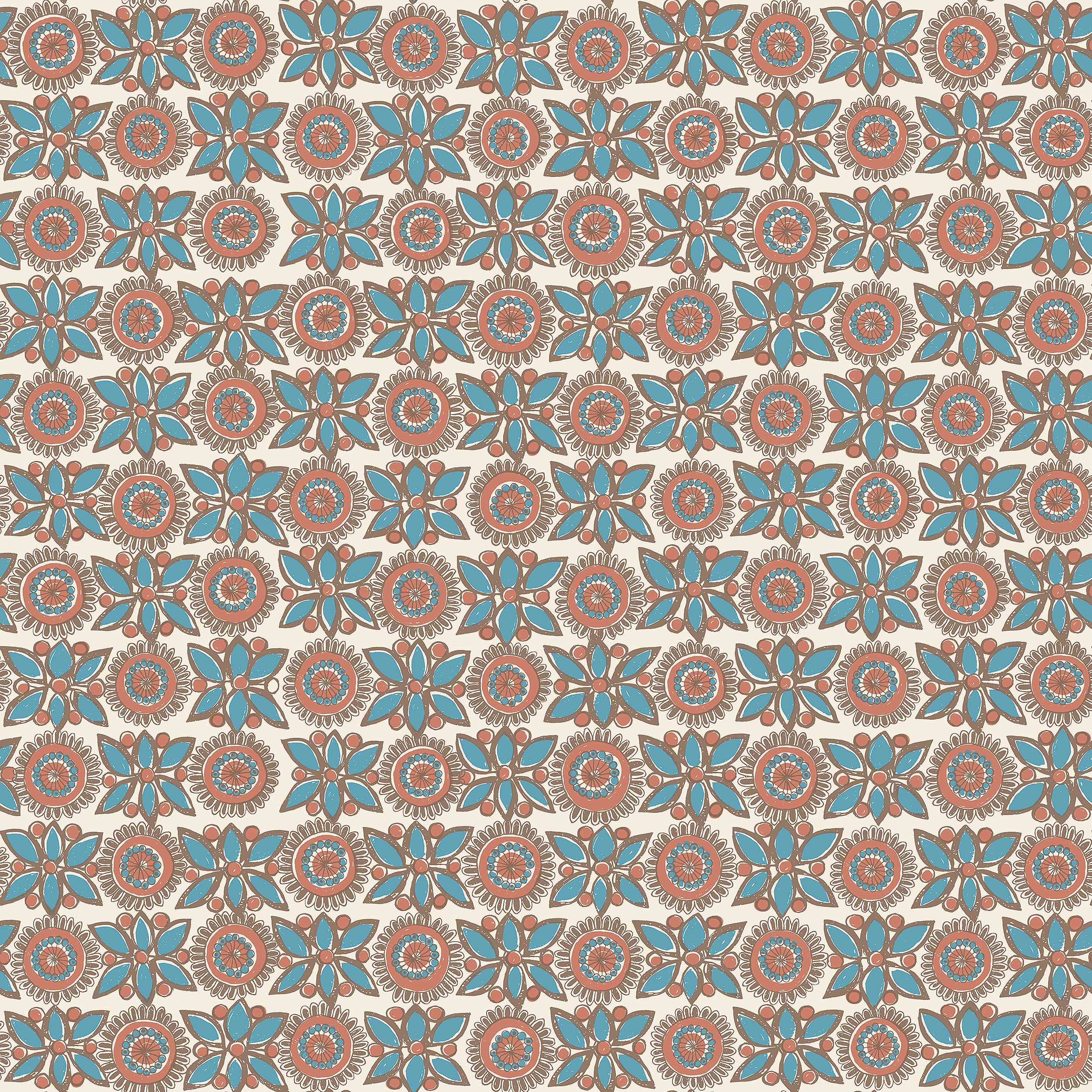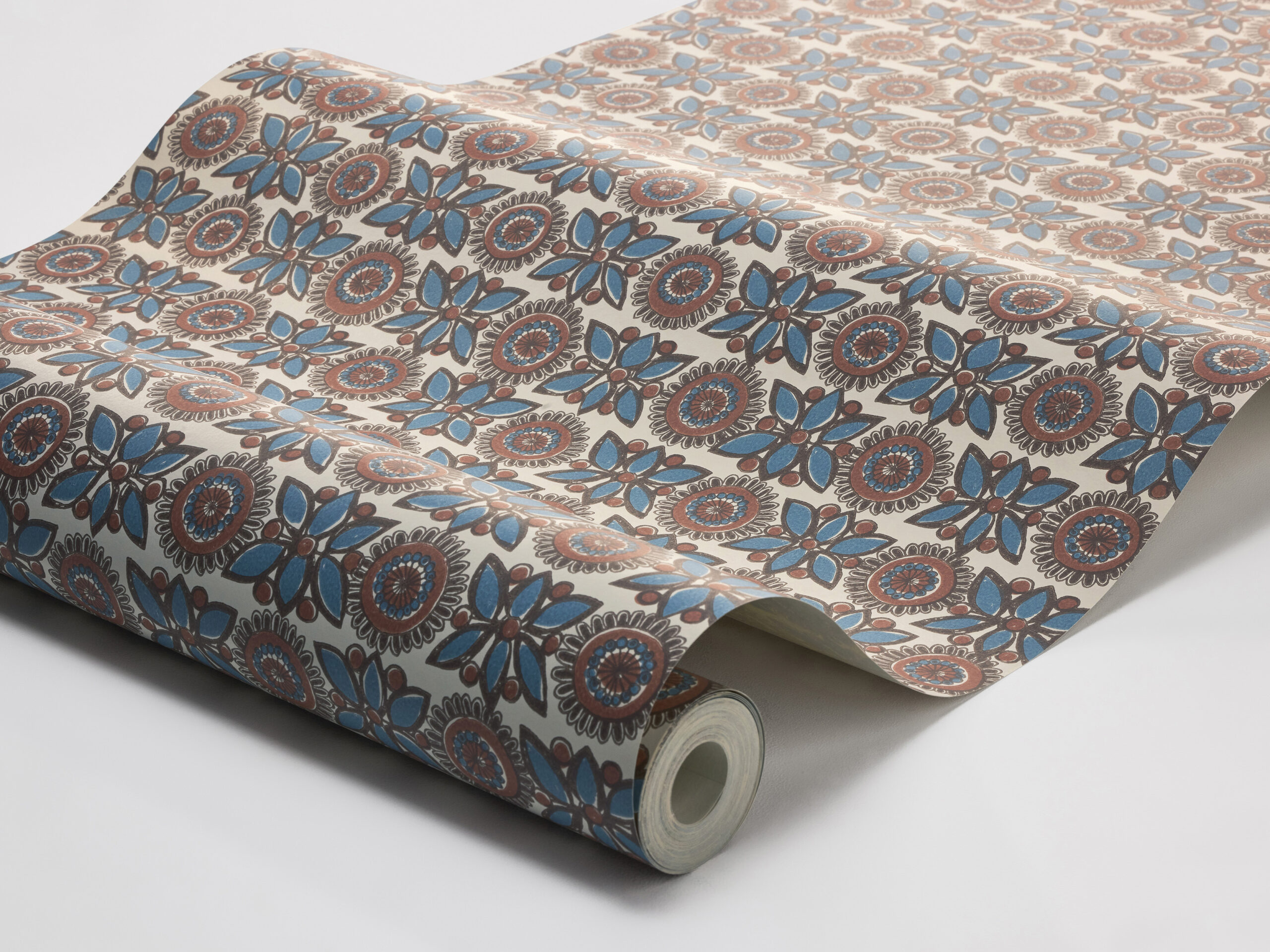Turi Gramstad Oliver inspirerades ofta av norsk allmogekonst, och mönstret på tapeten Astrid är inget undantag. De fritt målade formerna bär tydliga likheter med norskt rosenmåleri, och färgskalans milda toner av brunt, rött och blått på en ljust rosatonad botten känns också typiskt allmoge. Astrid blev en succé när mönstret släpptes på porslin 1966, och nu trycker vi denna formstarka, tidlösa mönsterklassiker som tapet.